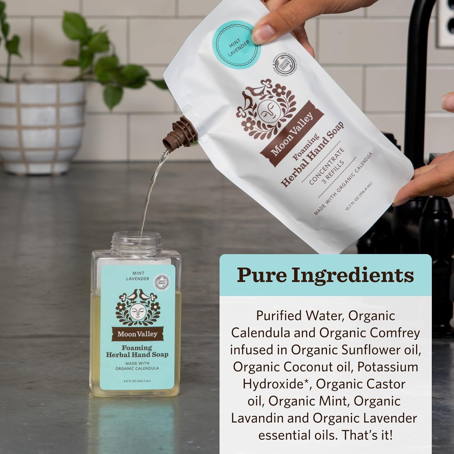 • REFILL PACK: This is a bundle of two 10.7oz Mint Lavender Refill Pouches for Moon Valley foaming hand soap dispensers. Each pouch comes with enough concentrate to refill a standard recyclable dispenser three times. Unlike liquid soap, this concentrate is formulated for foaming dispensers.