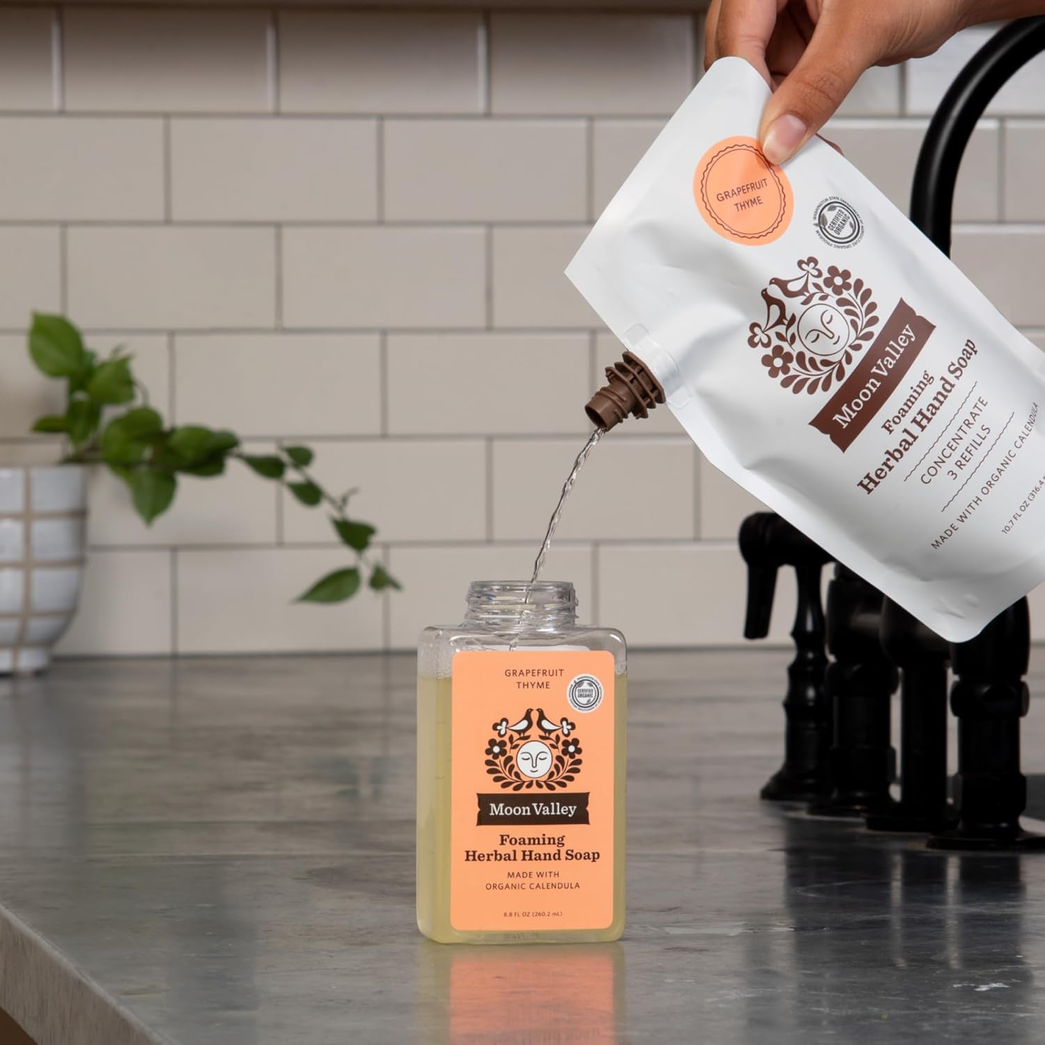 • REFILL PACK: This is a bundle of three 10.7oz Refill Pouches for Moon Valley foaming hand soap dispensers. Each pouch comes with enough concentrate to refill a standard recyclable dispenser three times. Unlike liquid soap, this concentrate is formulated for foaming dispensers.