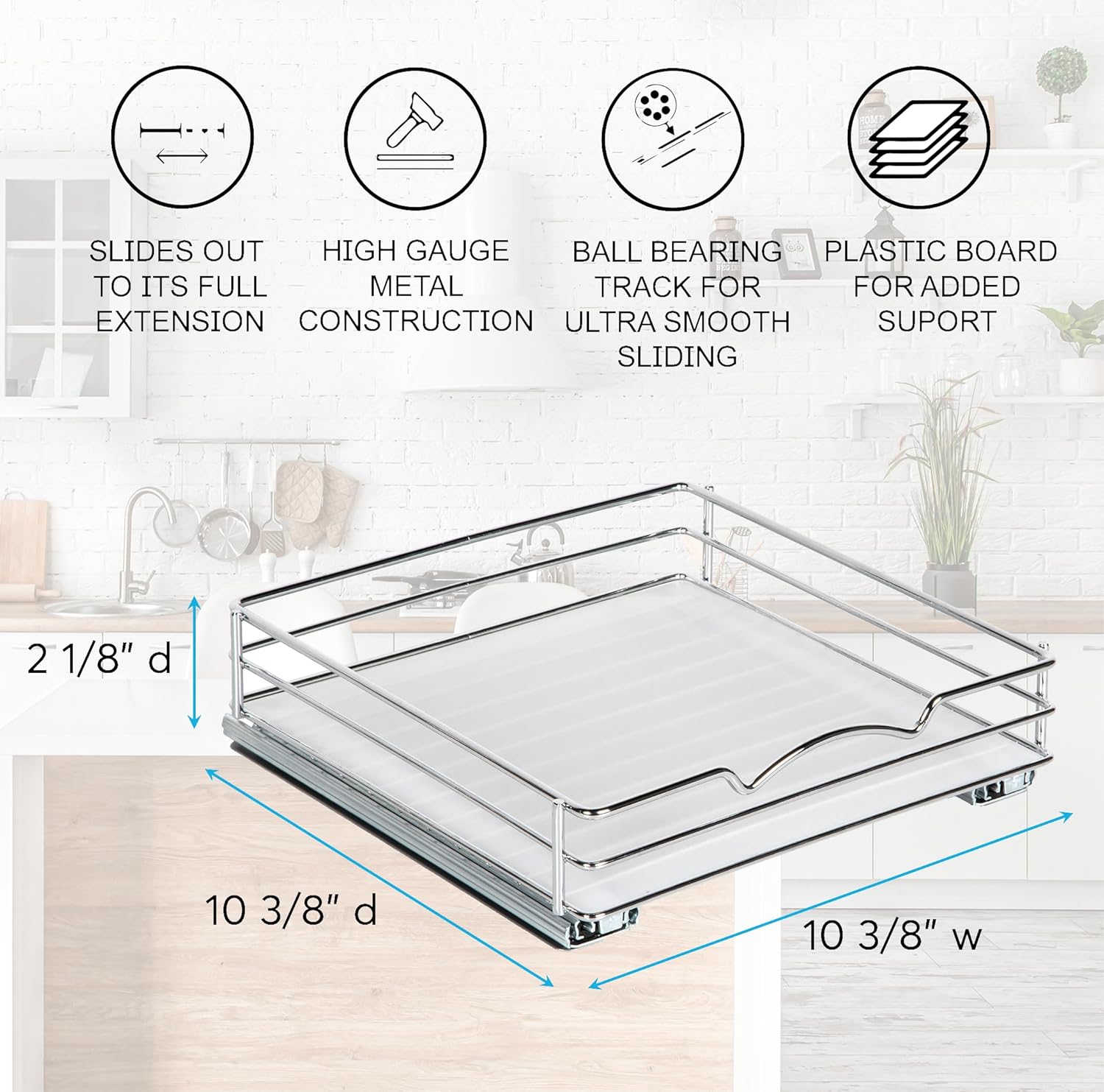 Pull Out Cabinet Organizer for Spices, Cans - Heavy Duty with Lifetime Limited Warranty- Pull Out Spice Rack- Cabinet Pull Out Shelf for Cans,Dishes, Etc, 10"W x 10"D x 2-1/8 H, Chrome