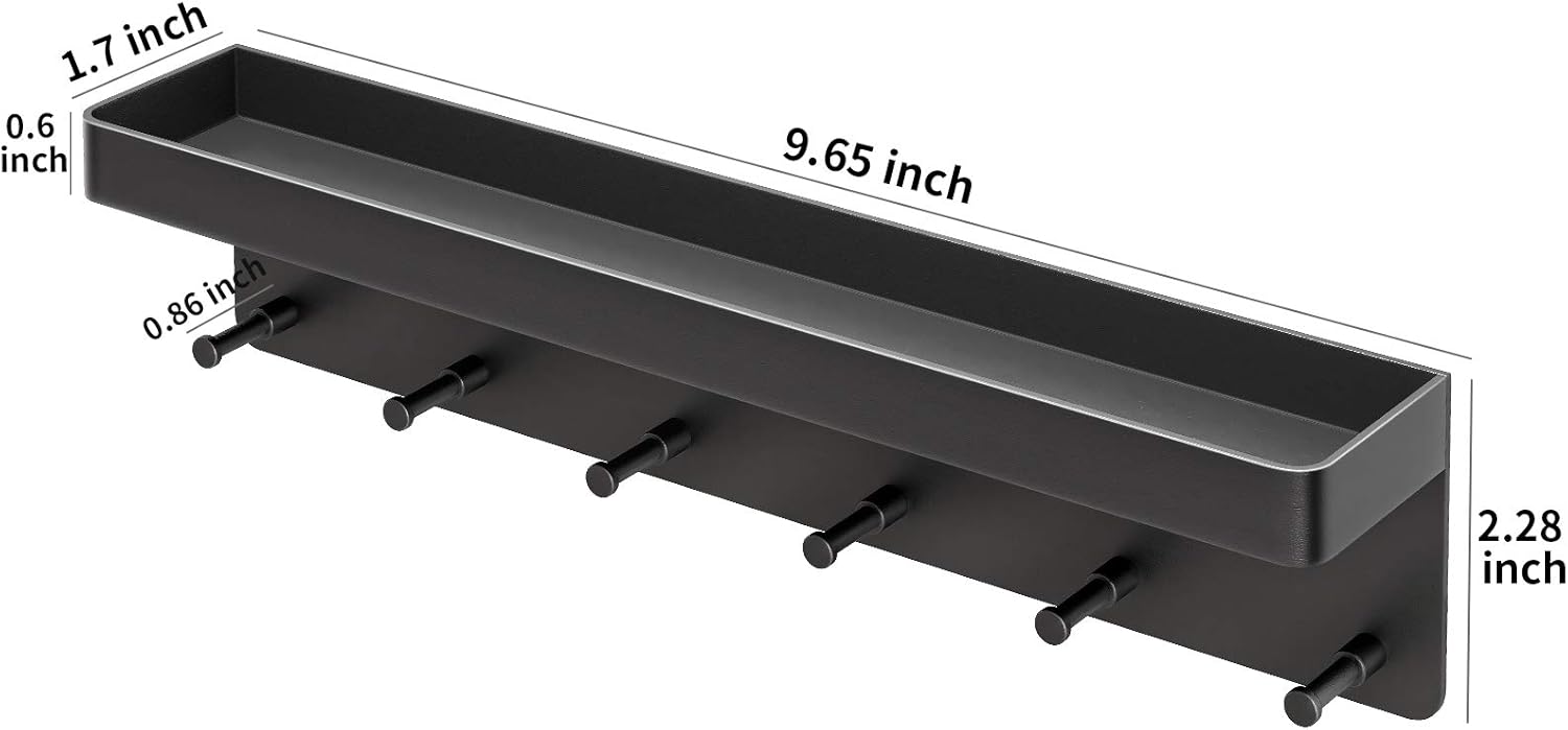 • Size : 9.65(L)x2.28(H)x1.7(W) inch. Length of Hooks:0.86 inch.Our key rack for wall with 6 key hooks and practical shelf space has you well equipped for a home