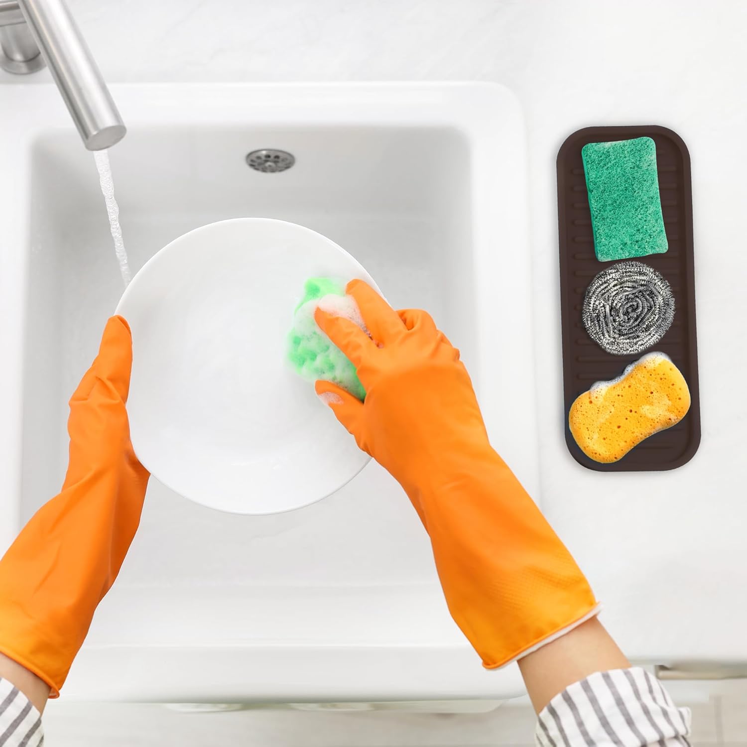 • MESS-FREE KITCHEN: Effortlessly keep your sink and kitchen countertop free from soapy residue with our sponge holder. With a size of 3.5 x 9 inches, this silicone tray is ideal for holding a cleaning sponge, brush, scrubbers, dish soap bottle, hand soap bar, and silverware. You can also use it in your utility rooms, bathroom, laundry area, and even your vanity.
