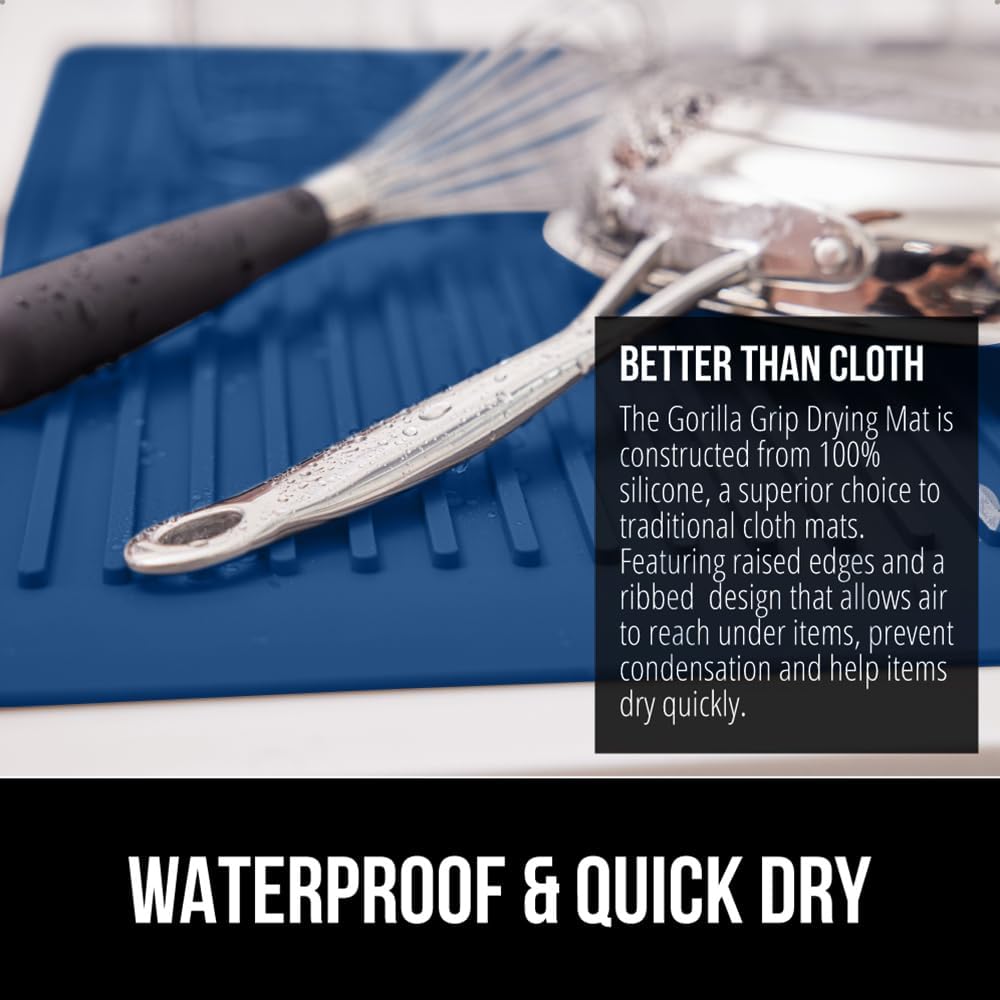 GORILLA GRIP 100% BPA-Free Patented Silicone Dish Drying Mat for Kitchen Counter, 18x24 Inch, Water Catching Ribbed Design, Easy Clean Waterproof Sink Liner, Heat Resistant, Fits Under Rack, Blue