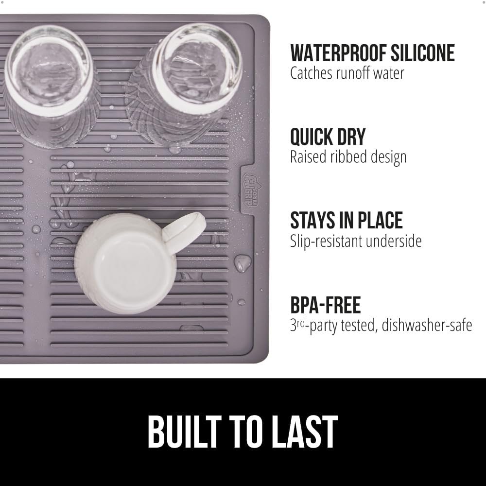 GORILLA GRIP 100% BPA-Free Patented Silicone Dish Drying Mat for Kitchen Counter, Water Catching Ribbed Design, Easy Clean Waterproof Sink Liner, Heat Resistant, Fits Under Rack, 16x12 Inch, Gray