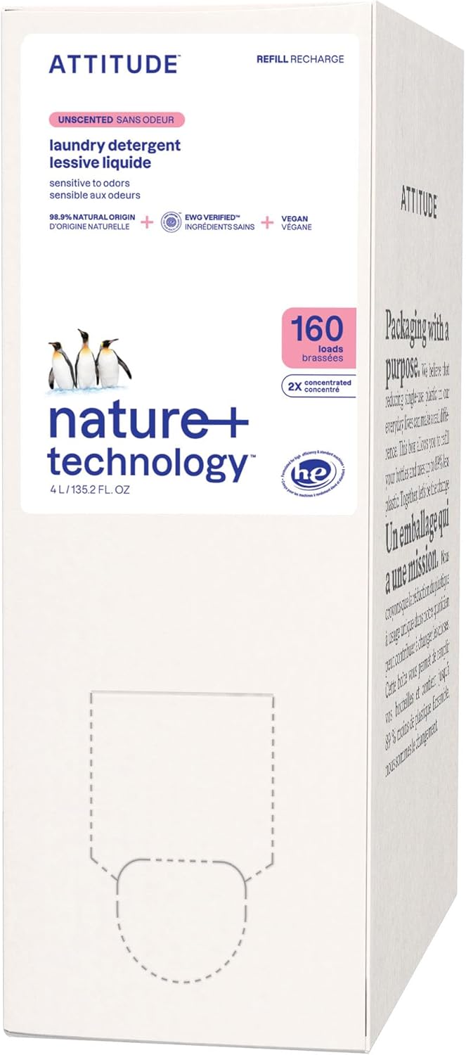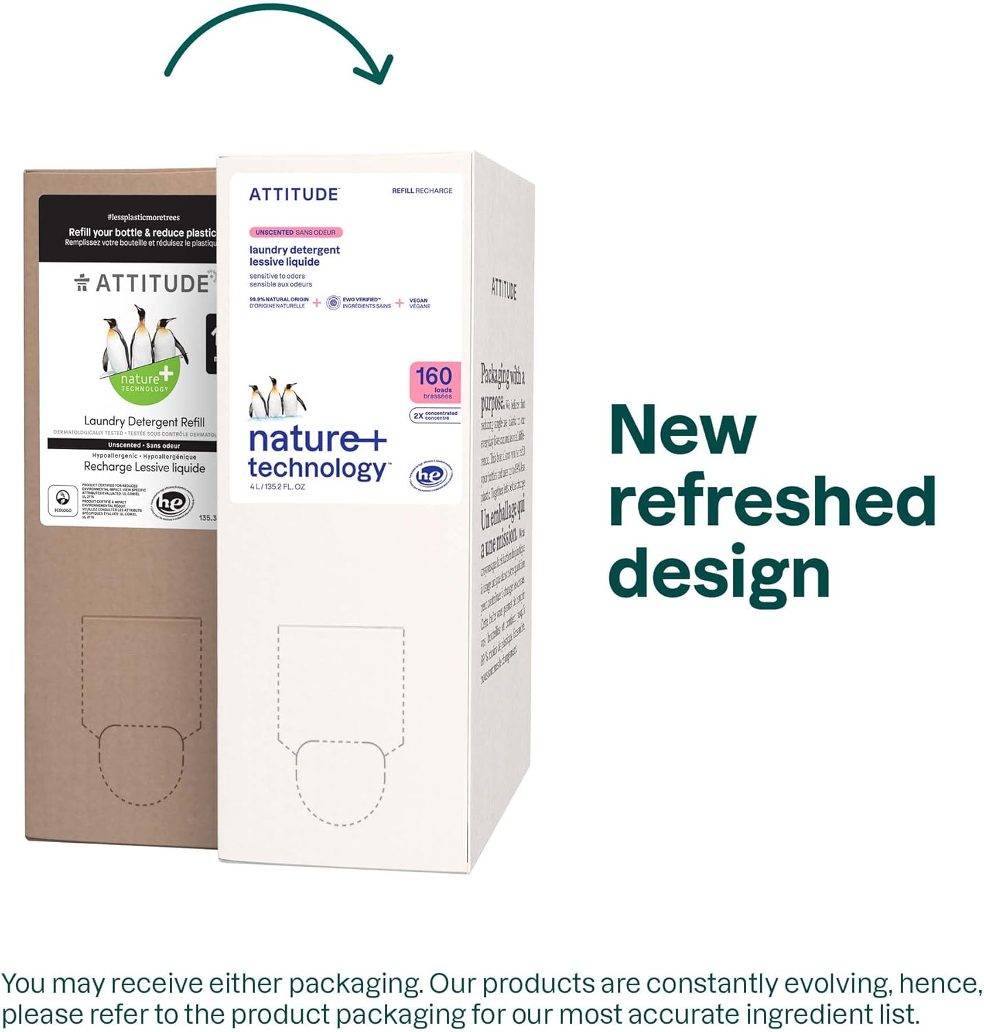 ATTITUDE Liquid Laundry Detergent Refill, EWG Verified, HE Compatible, Plant-Based & Vegan, Natural Laundry Soap, Unscented, 160 Loads, 135.26 Fl Oz
