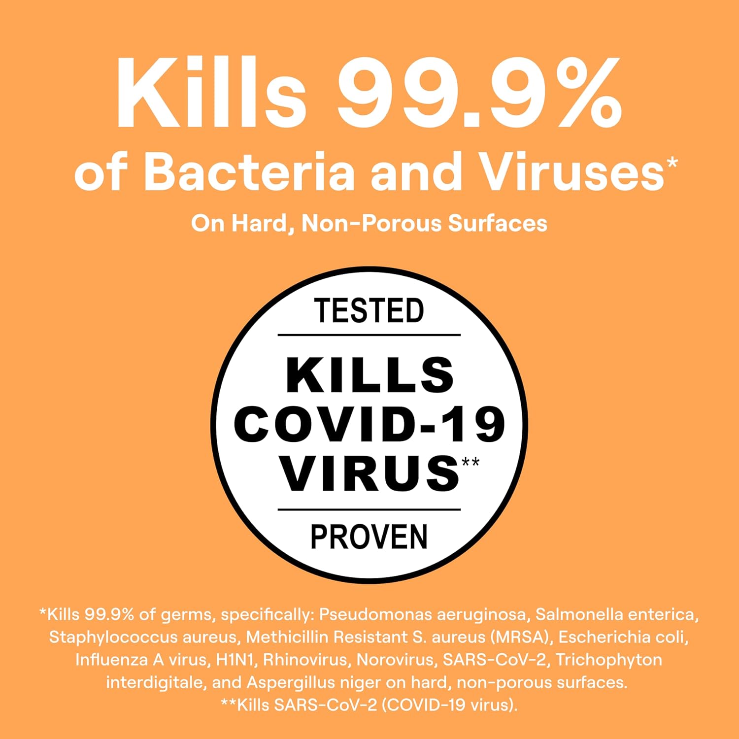 • Disinfecting Multi-Surface Cleaner kills 99.9% of bacteria and viruses* and COVID-19 virus** on hard non-porous surfaces (refer to product label for details)