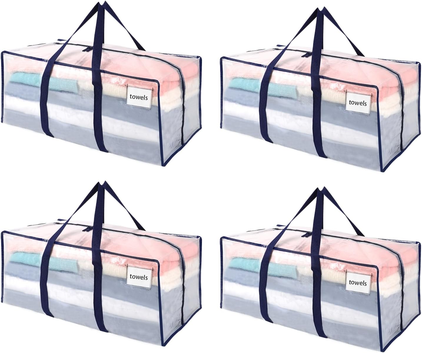 VENO 4 Pack Moving Bags Plastic Storage Totes Clothes Organization Large W Lid/Zipper. Packing Boxes/Bins Alternative. Space Saving Foldable College Supplies Essentials (Clear, 4 Pack)