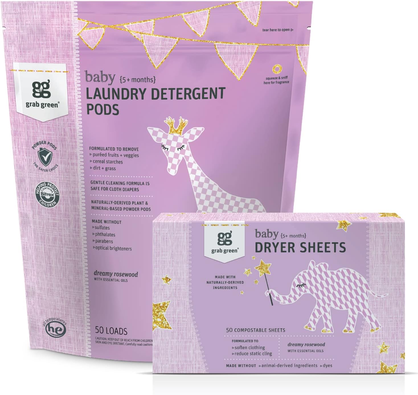 Grab Green Baby Laundry Detergent Pods and Dryer Sheets Bundle, 50 Count Pods and 80 Dryer Sheets, Dreamy Rosewood Scent, Plant and Mineral Based Laundry Care Set