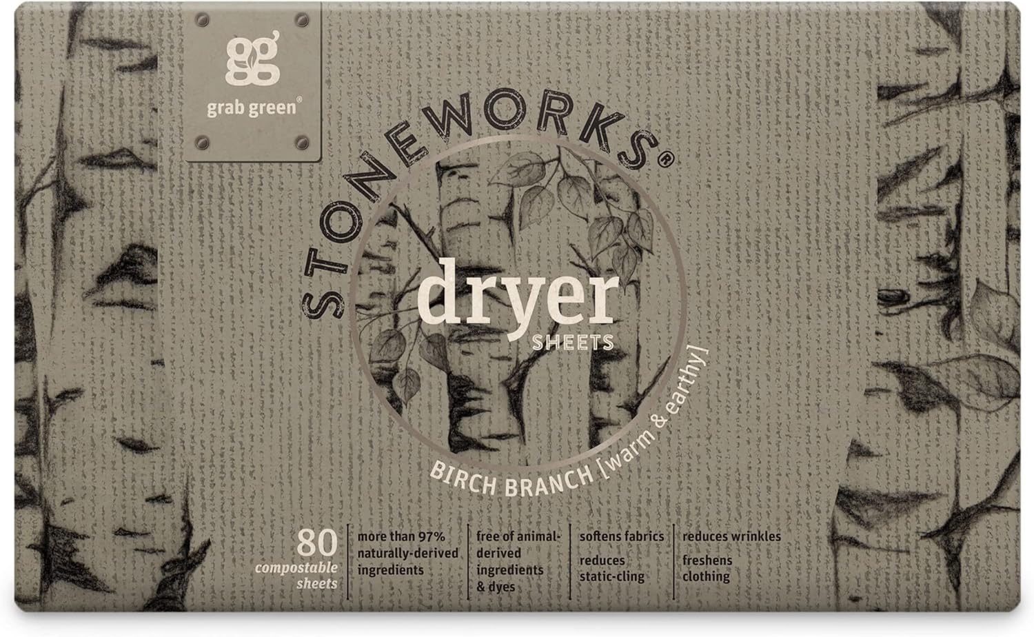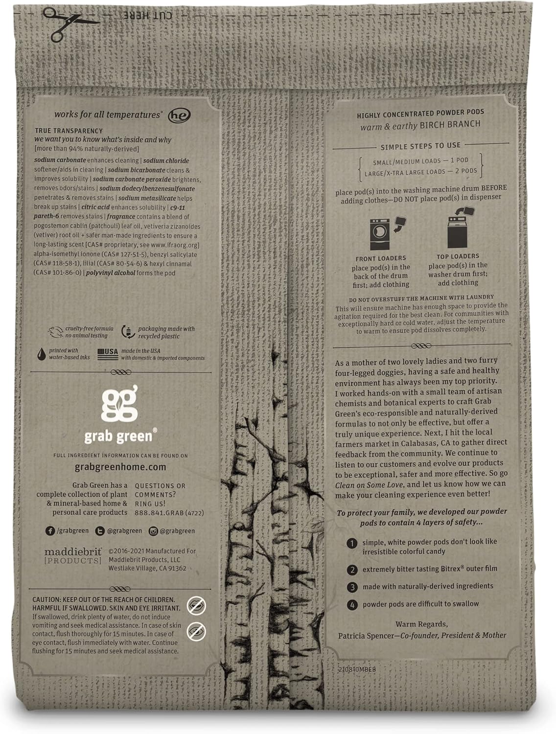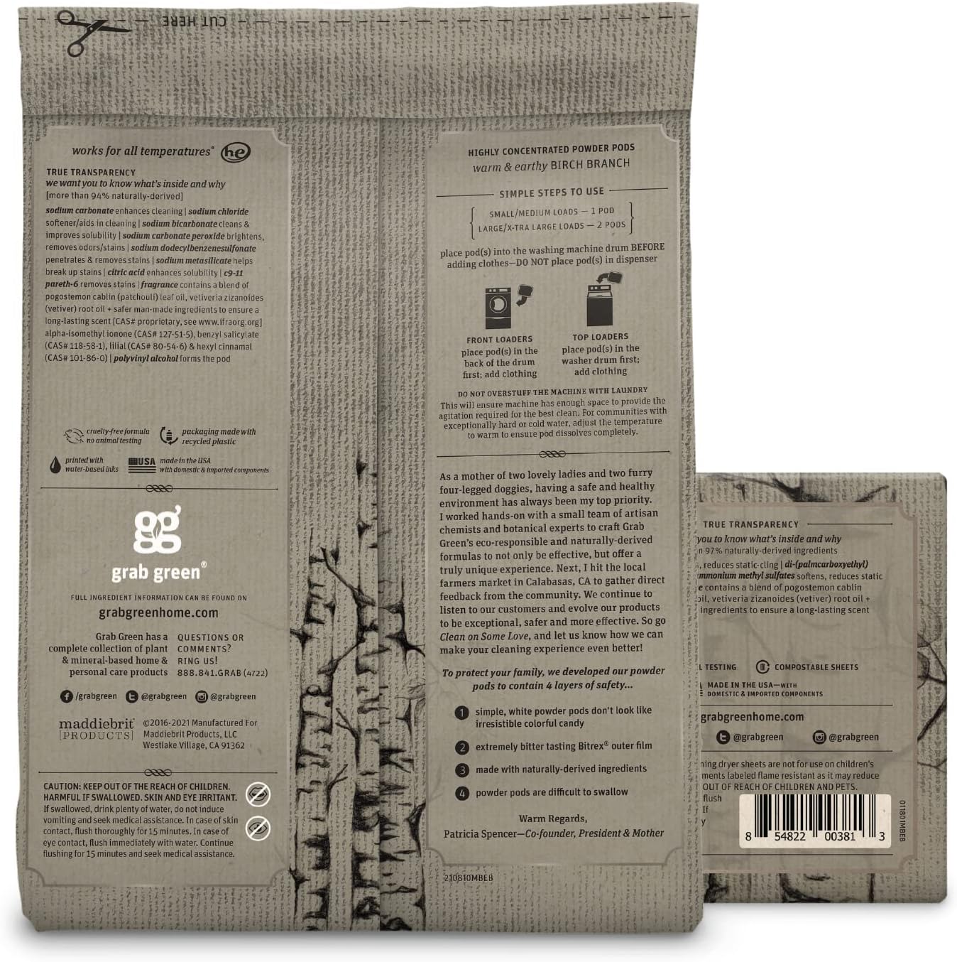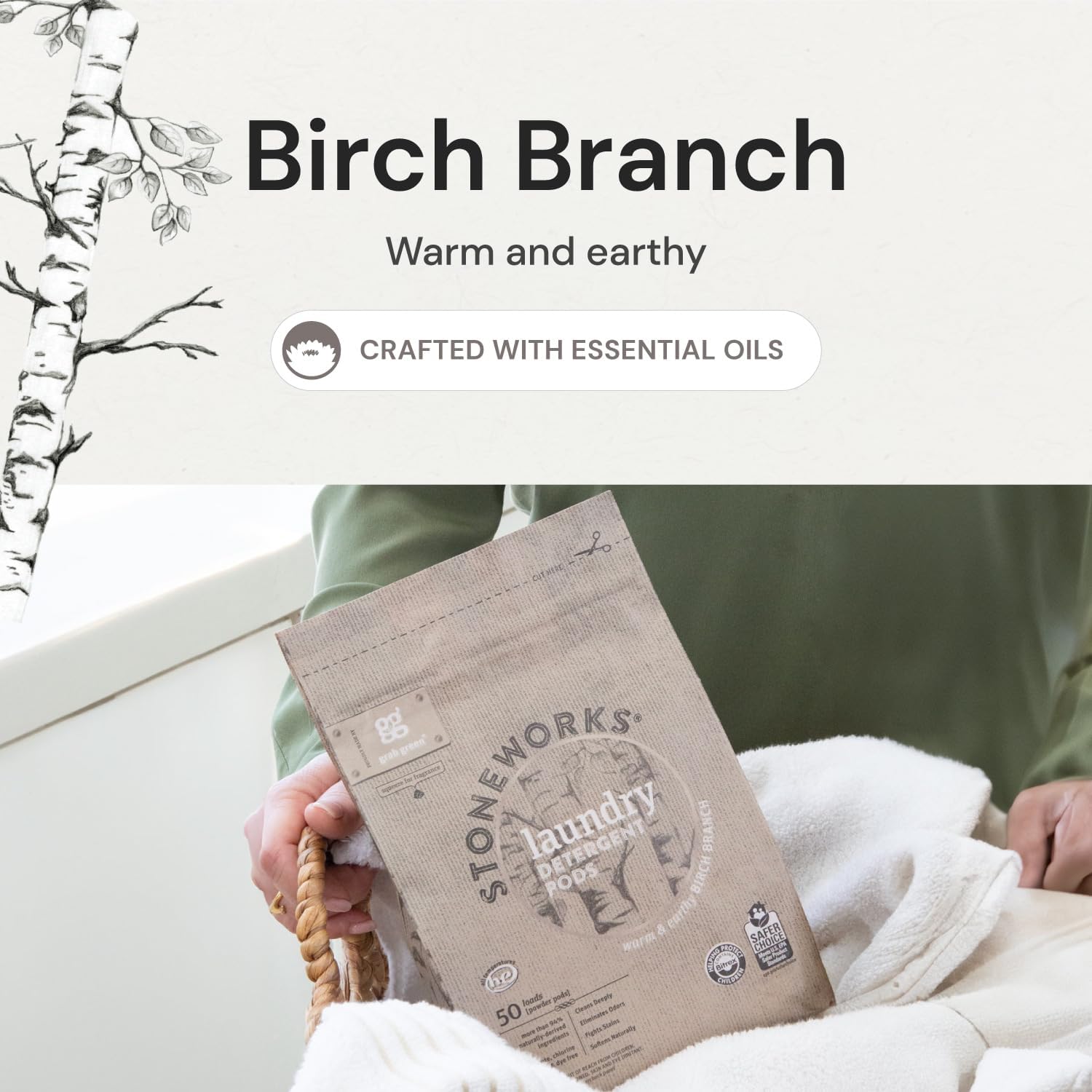 • Contains: 1- 50 Pod Bag of Grab Green Stoneworks Birch Branch Laundry Detergent Pods and 1- 80 Sheet Box of Grab Green Stoneworks Natural, Compostable Birch Branch Dryer Sheets