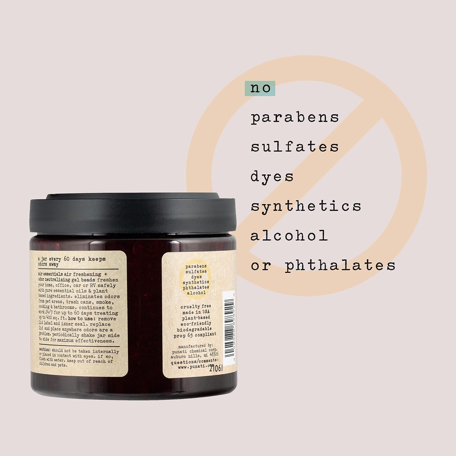 • MADE IN THE USA - Air Essentials Gel Beads do not contain parabens, sulfates, dyes, synthetics, alcohol or phthalates. Every jar is proudly Made in the USA and is formulated with plant derived ingredients.