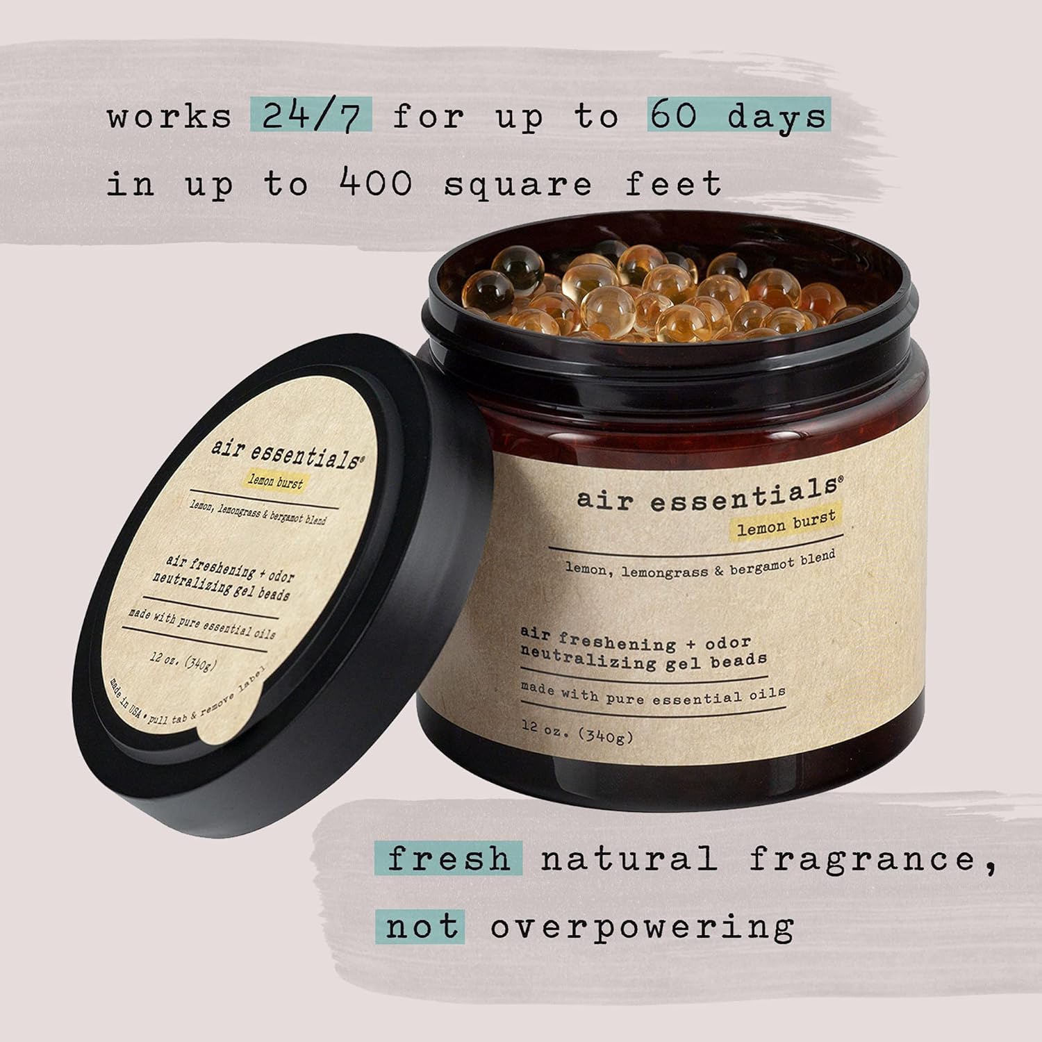 • MADE WITH PURE ESSENTIAL OILS - Air Essentials Air Freshening & Odor Neutralizing Gel Beads contain only plant derived ingredients and a blend of pure essential oils. Each jar provides a pleasant fragrance that does not overwhelm the senses. The Gel Beads will work 24/7 for up to 60 days in up to 400 square feet.