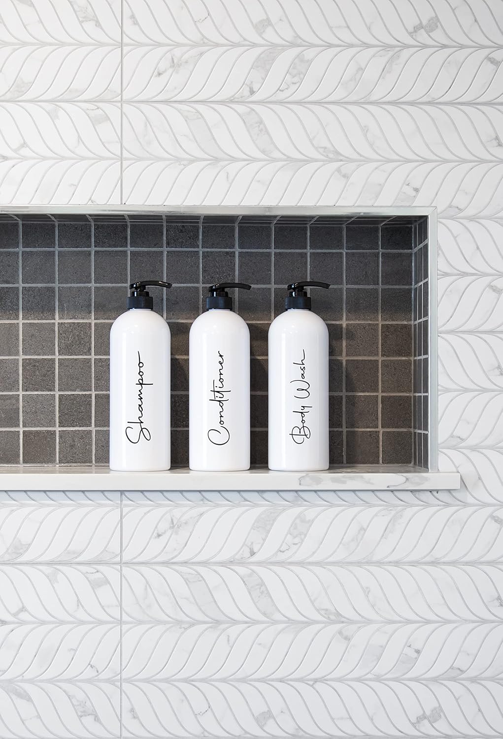 • LUXURIOUS HIGH-END STYLE APPEAL - A luxurious high-end look offsets your bathroom beautifully with elegant black script on a clean white background. Gorgeous silkscreened labels are permanent and peel-proof. Go from cramped and cluttered to soothing and spa-like.