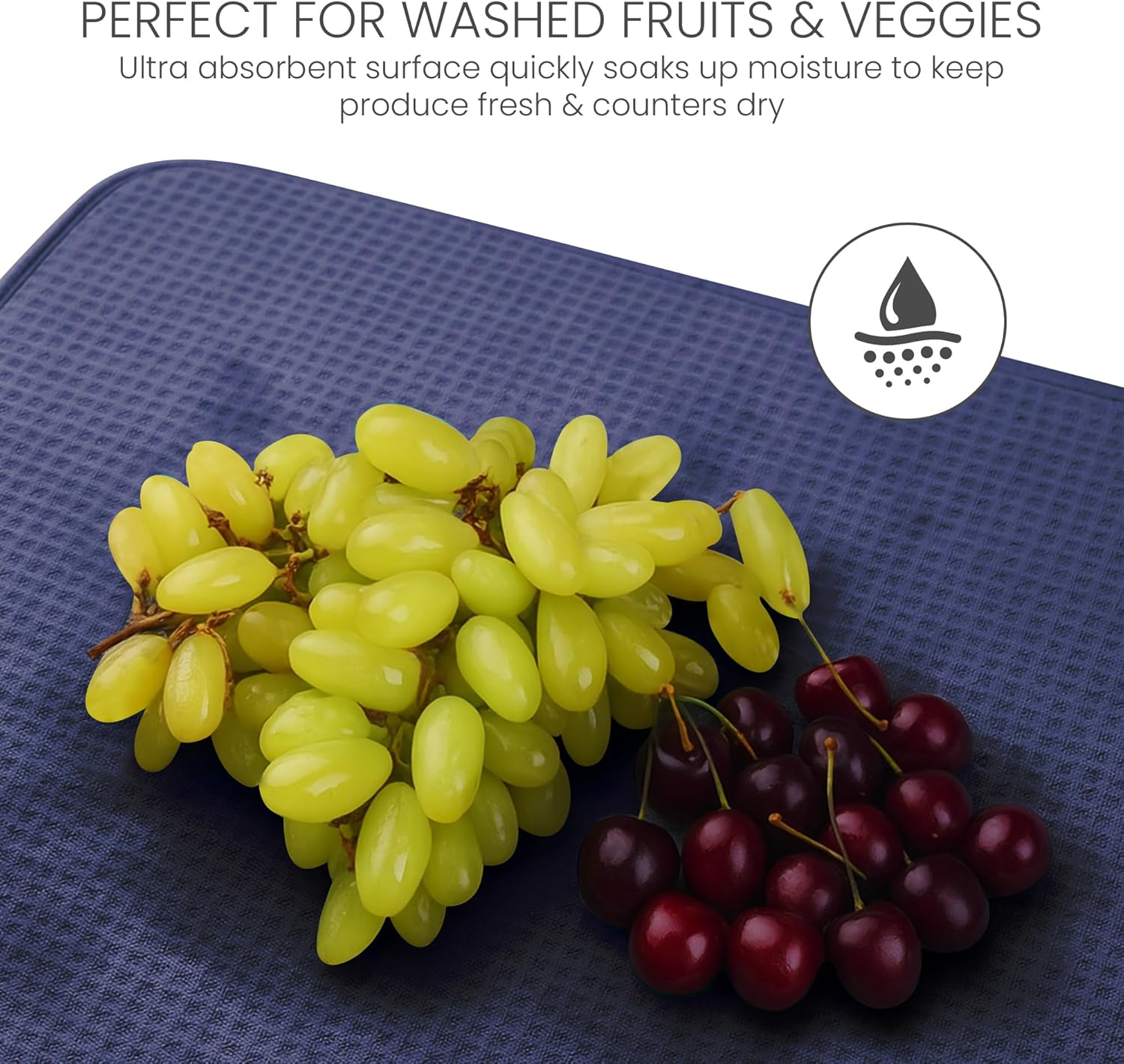 • THICKEST , STYLISH MAT | INNOVATIVE HONEYCOMB WEAVE: Keep your counter spotless even while washing a sink full of dishes . Our superbly stylish drying mat is among the thickest on the market today , and its innovative honeycomb microfiber structure enhances absorption and quickens drying time .