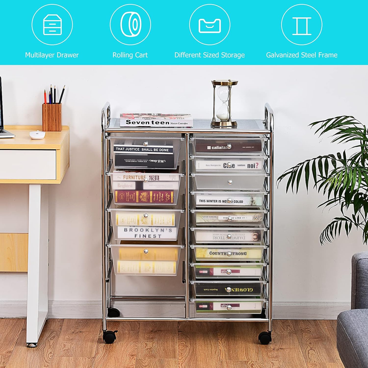 GOFLAME 15-Drawer Rolling Storage Cart, Multipurpose Movable Organizer, Utility Cart for Home, Office, School, Clear