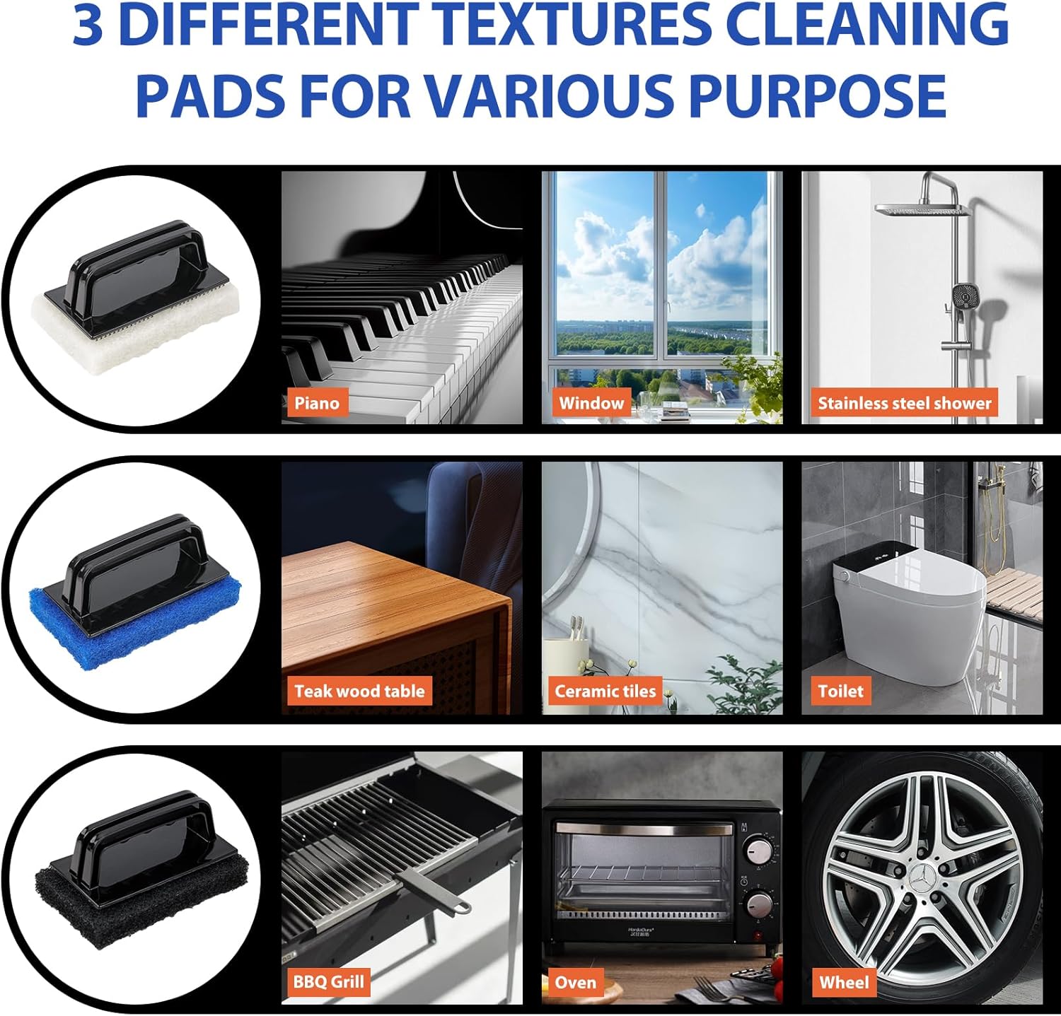 • PERFECT CLEANING KIT FOR EVERY SURFACE features three distinct pads (fine, medium, coarse), designed to handle a range of cleaning tasks from delicate to heavy-duty, work great on piano, glass, stainless steel, vinyl, teak, ceramic, wood, boat bottom, wheel and aluminum etc.