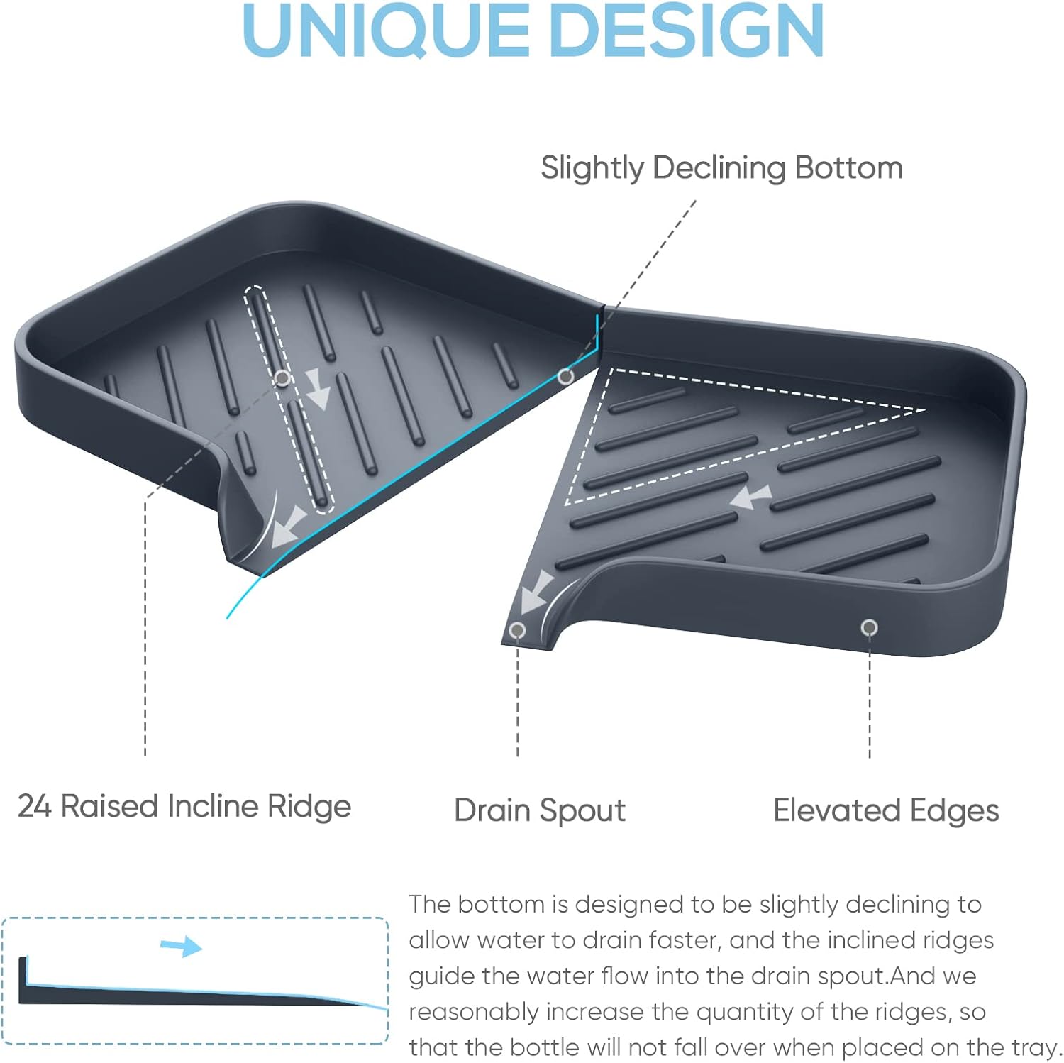 - 【The New Upgraded Kitchen Soap Tray】 After analyzing the advantages and disadvantages of many similar products, we made important upgrades in many details for our silicone kitchen sponge holder. The unique design and food-grade silicone material are suitable for any countertop, it helps keep the counters dry and organized. This silicone tray is non slip and very easy to clean. The upgraded self-draining design will drain the water faster. Choosing us will bring more convenience to your life!