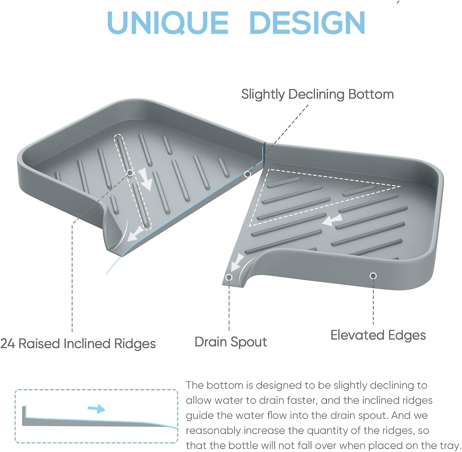 - 【The New Upgraded Kitchen Soap Tray】 After analyzing the advantages and disadvantages of many similar products, we made important upgrades in many details for our silicone kitchen sponge holder. The unique design and food-grade silicone material are suitable for any countertop, it helps keep the counters dry and organized. This silicone tray is non slip and very easy to clean. The upgraded self-draining design will drain the water faster. Choosing us will bring more convenience to your life!