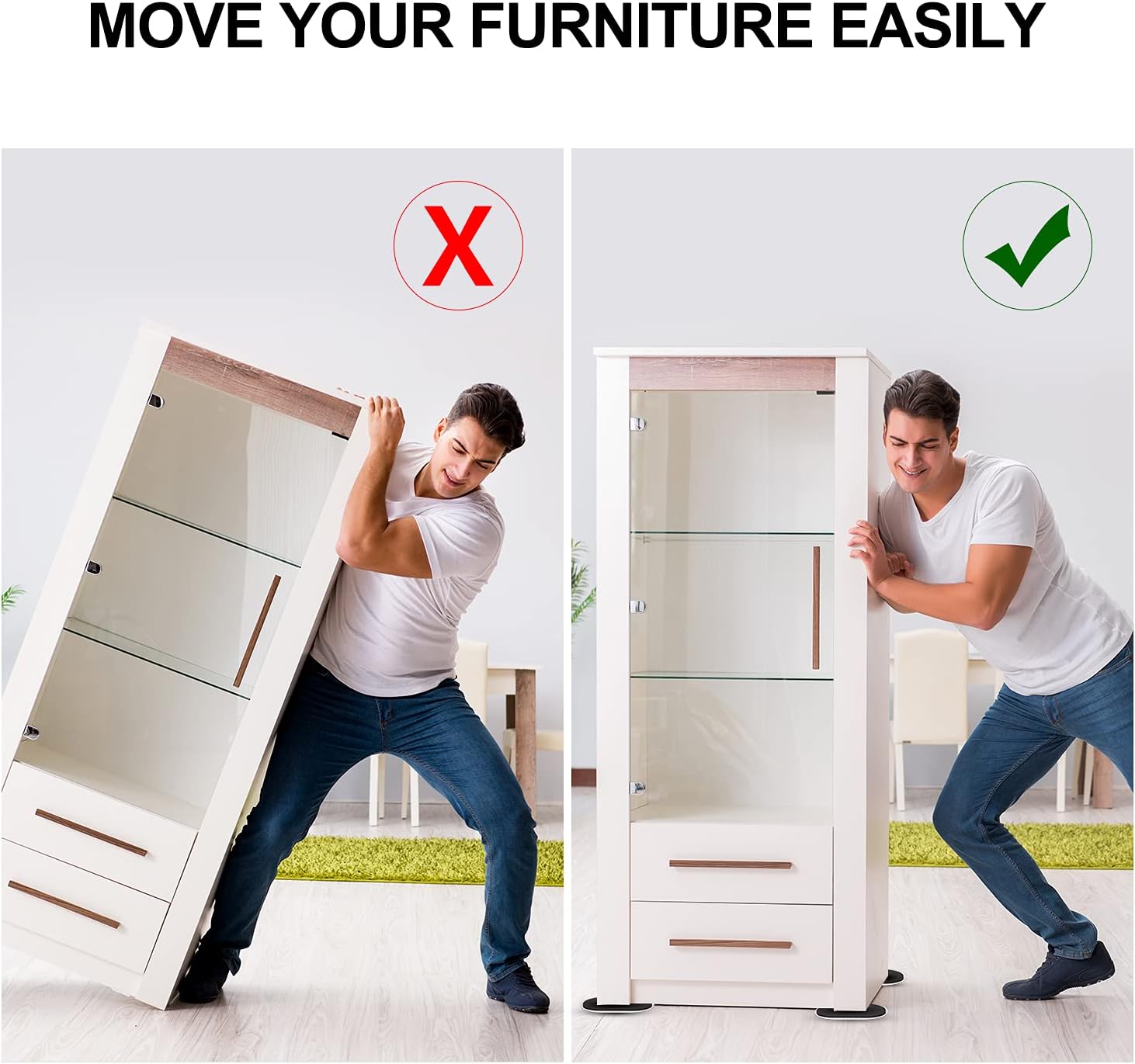 • ☛【Easy to Use】- Just tilt the furniture, slide a pad under each leg (black grip side up), and push.