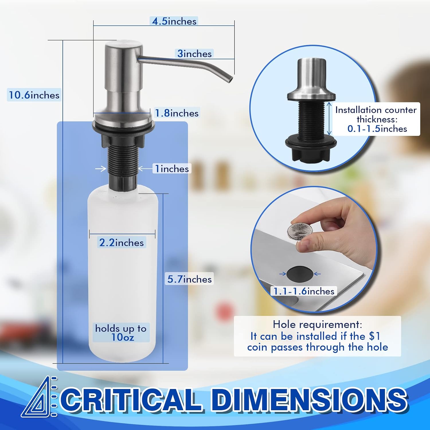 • Optimization Design: First-rate stainless steel kitchen soap dispenser for kitchen sink makes your kitchen simple and fresh, easy to fit most sink. Installing it in any type of kitchen sink or countertop (granite, stainless steel, wood)makes more convenient to use.