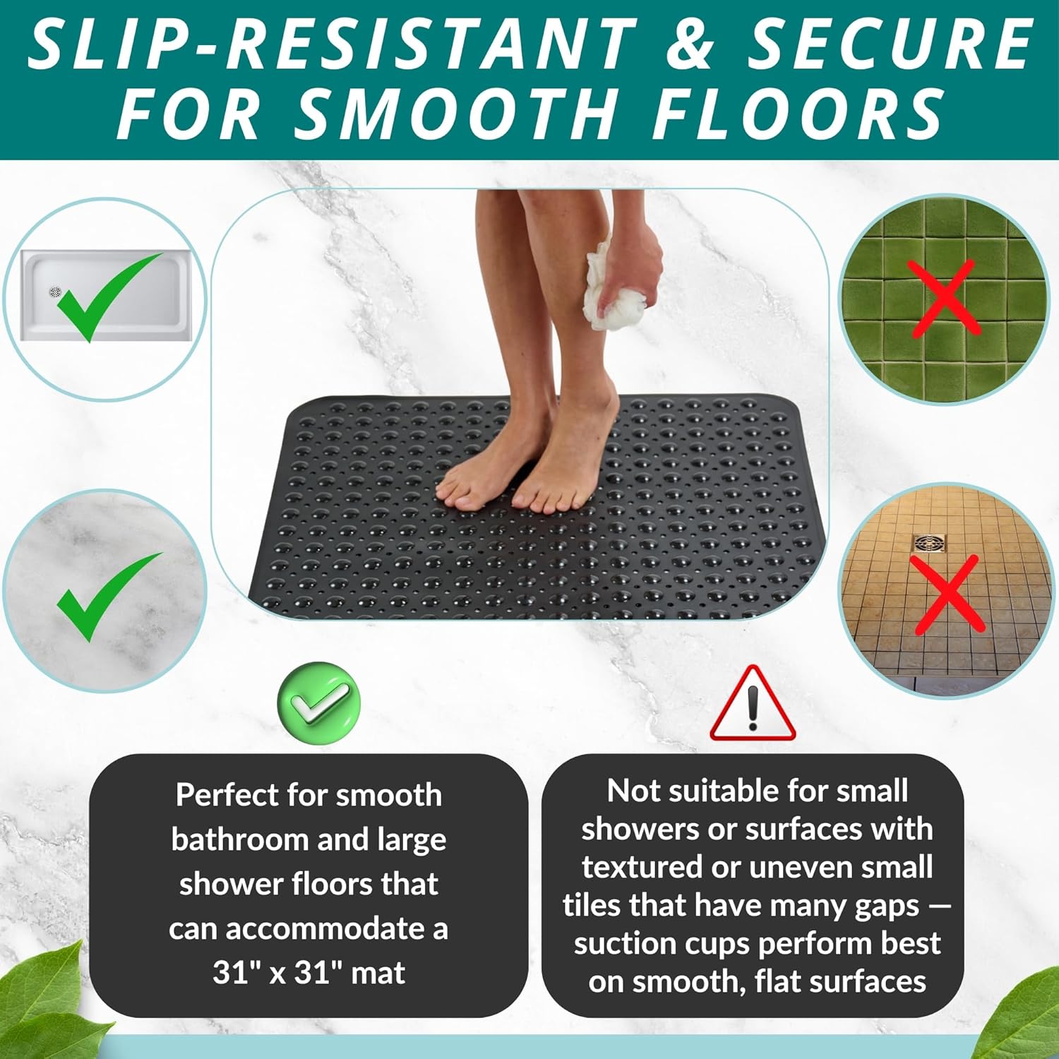 • NON-SLIP MAT enjoy 360-degree protection in your shower; prevent falls with an extra large Square bathroom shower bath mat for larger shower stalls with pliable suction cups for secure sticking capacity to help securely hold the shower mat to shower stall floors for safe anti-slip protection