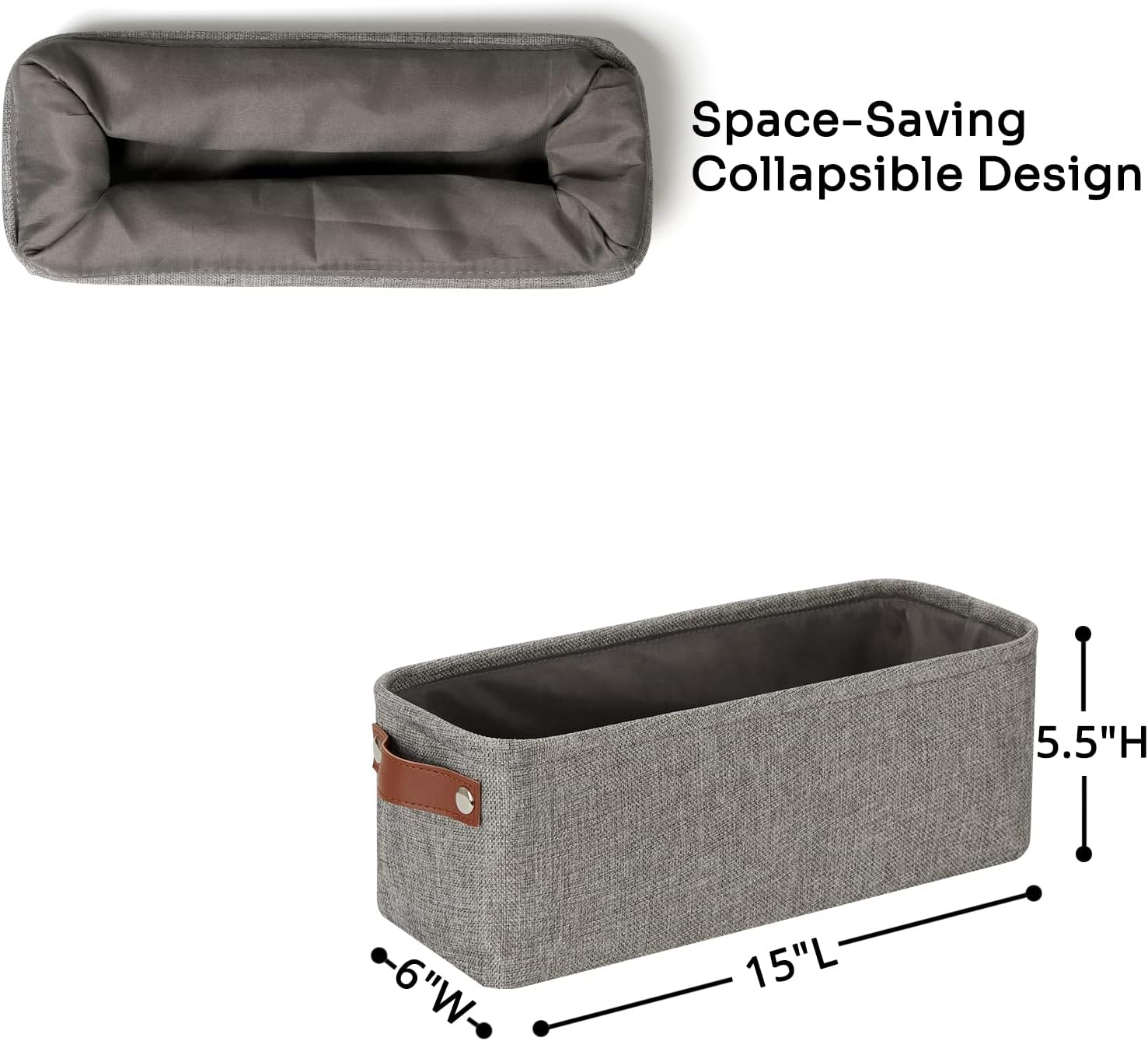 • 【Unique Design & Modern & Decorative】Set of 2 small toilet paper baskets, dimensions(each): 15(L) x 6(W) x 5.5(H) inches. Fabric storage baskets bring you organizing convenience and a sweet home. Great for socks, underwear, books, magazines, toys, pet products, wipes, towels, decorations, office supplies, DVDs, and gifts. The fabric baskets with neutral colors can match a lot of home styles - keeping your home nice and tidy.