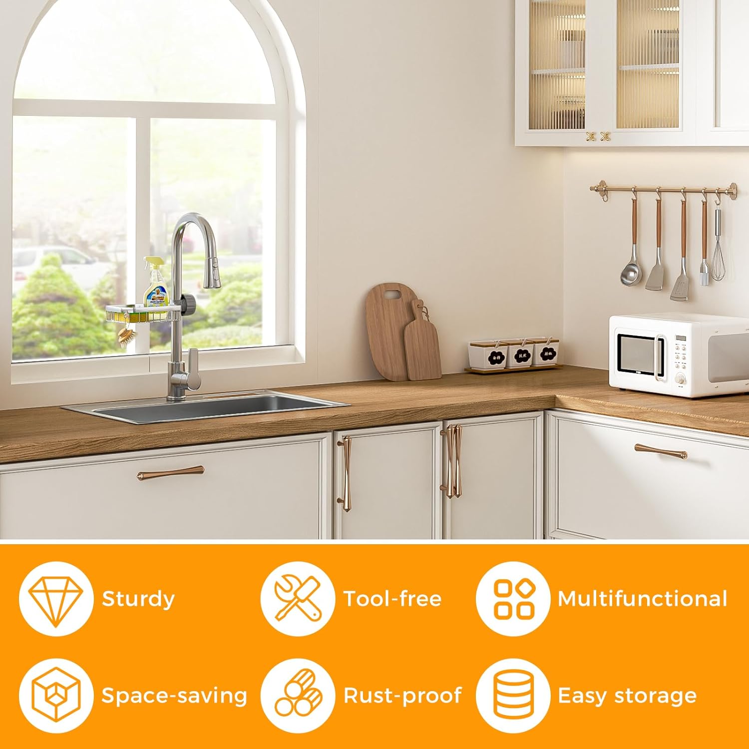 • Multi-functional Design: Our stainless steel kitchen faucet organizer rack does more than just hold sponges—it also acts as a dish brush stand, soap holder, and more. It fits over various kitchen faucet sizes.