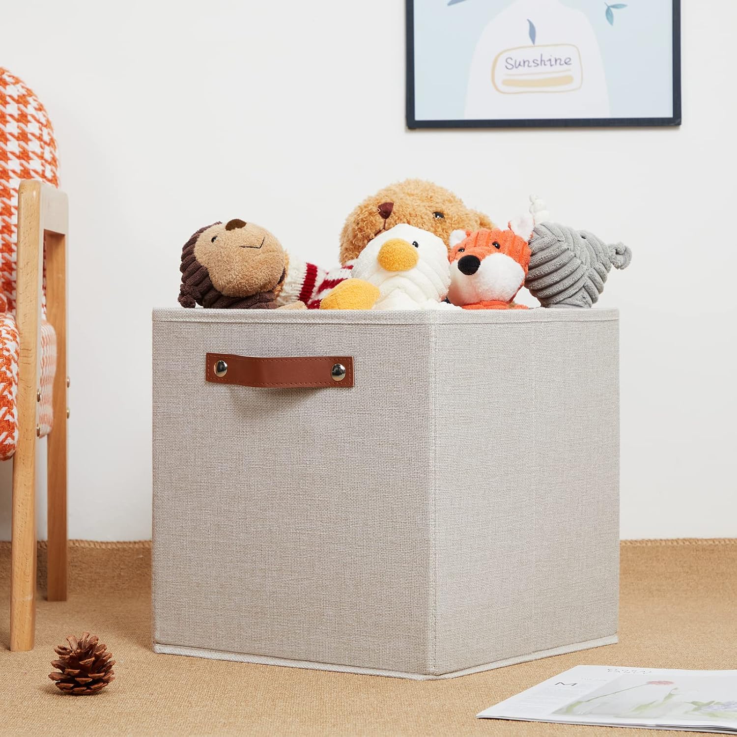 - 【Material】These cube storage bins are constructed of sturdy and attractive linen & cardboard with linen interior lining. The sturdy leather handles make it easy to carry or pull off and out of shelves.