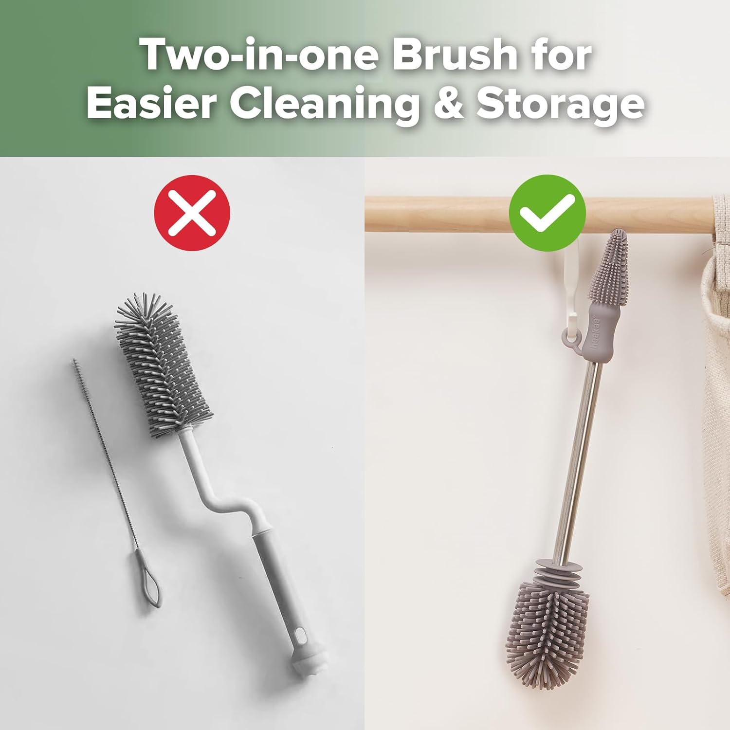 • Multipurpose Bottle Brush - Two different sizes of brush heads: ①Bottle Brush Head - perfectly-sized for scrubbing your baby bottles, breast pumps, and breastmilk storage bags. ②Angled Brush Head with an angled tip - reaches corners of your breast milk collectors, bottle teats and more.
