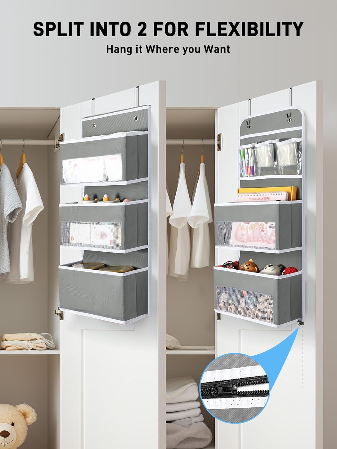 Yecaye 6-Tier Over the Door Storage Organizer, Flexible 1 Split into 2 Swing-proof Hanging Bathroom Storage Organization, Bedroom Organizer and Storage for Newborn Baby Essentials, Grey