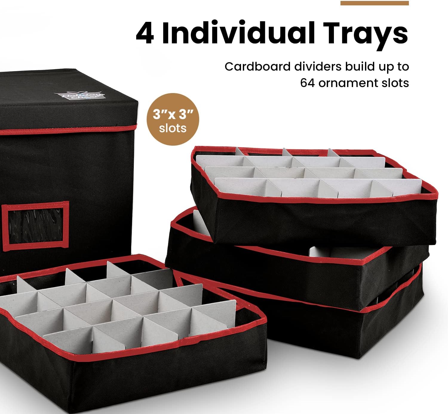 Holiday Cheer Premium Christmas Ornament Storage with 4 Tray – Christmas Storage Container with Dividers Perfect for Holiday Decorations– Fits 64 Holiday Ornaments – Tear-Proof Fabric