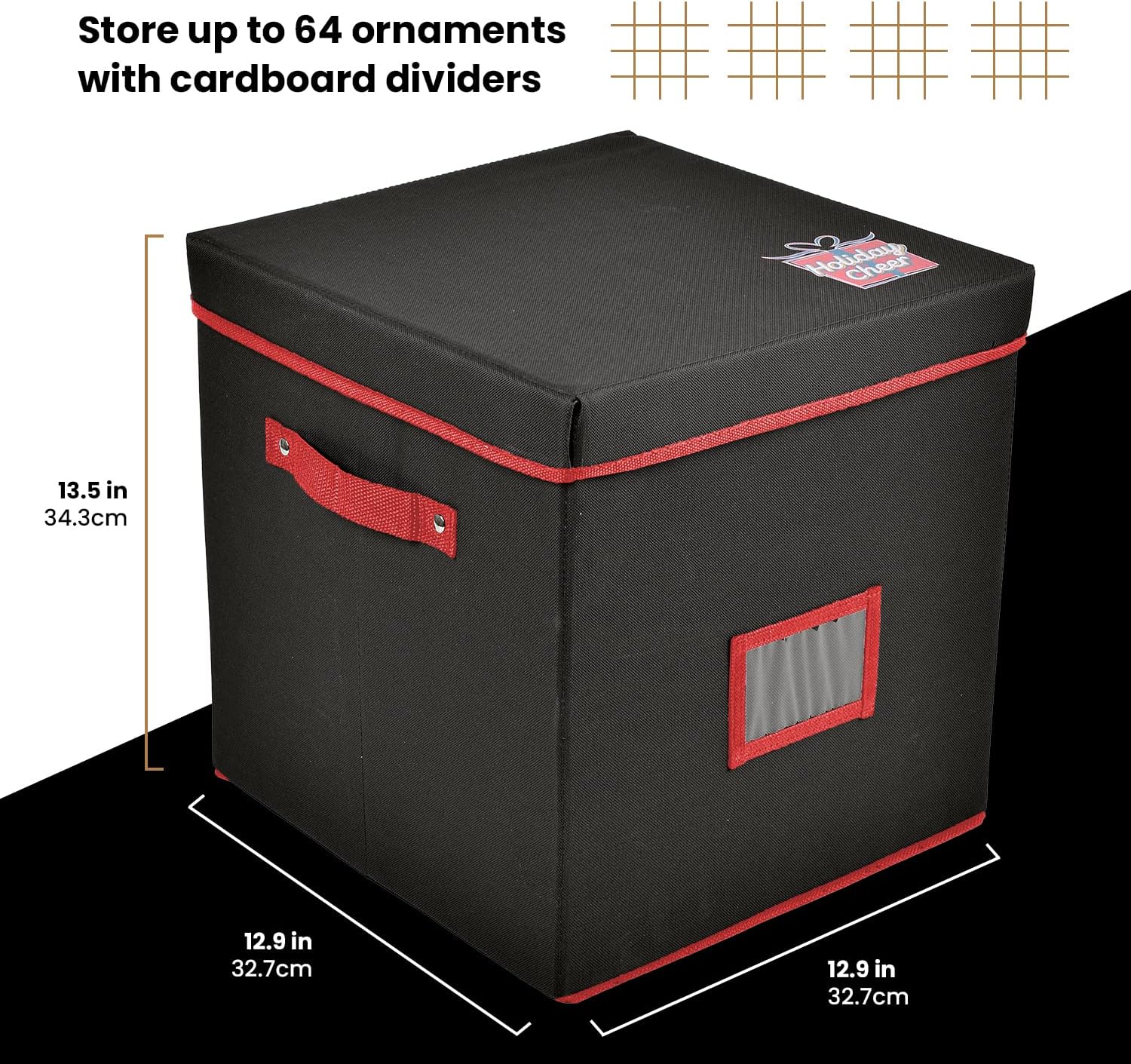 • STURDY CONSTRUCTION – This Christmas ornament storage is constructed of durable 600D oxford fabric with cardboard sides and includes built in handles. This Holiday Cheer Christmas storage box is perfect for holiday ornament storage with a transparent card slot for easy labeling.