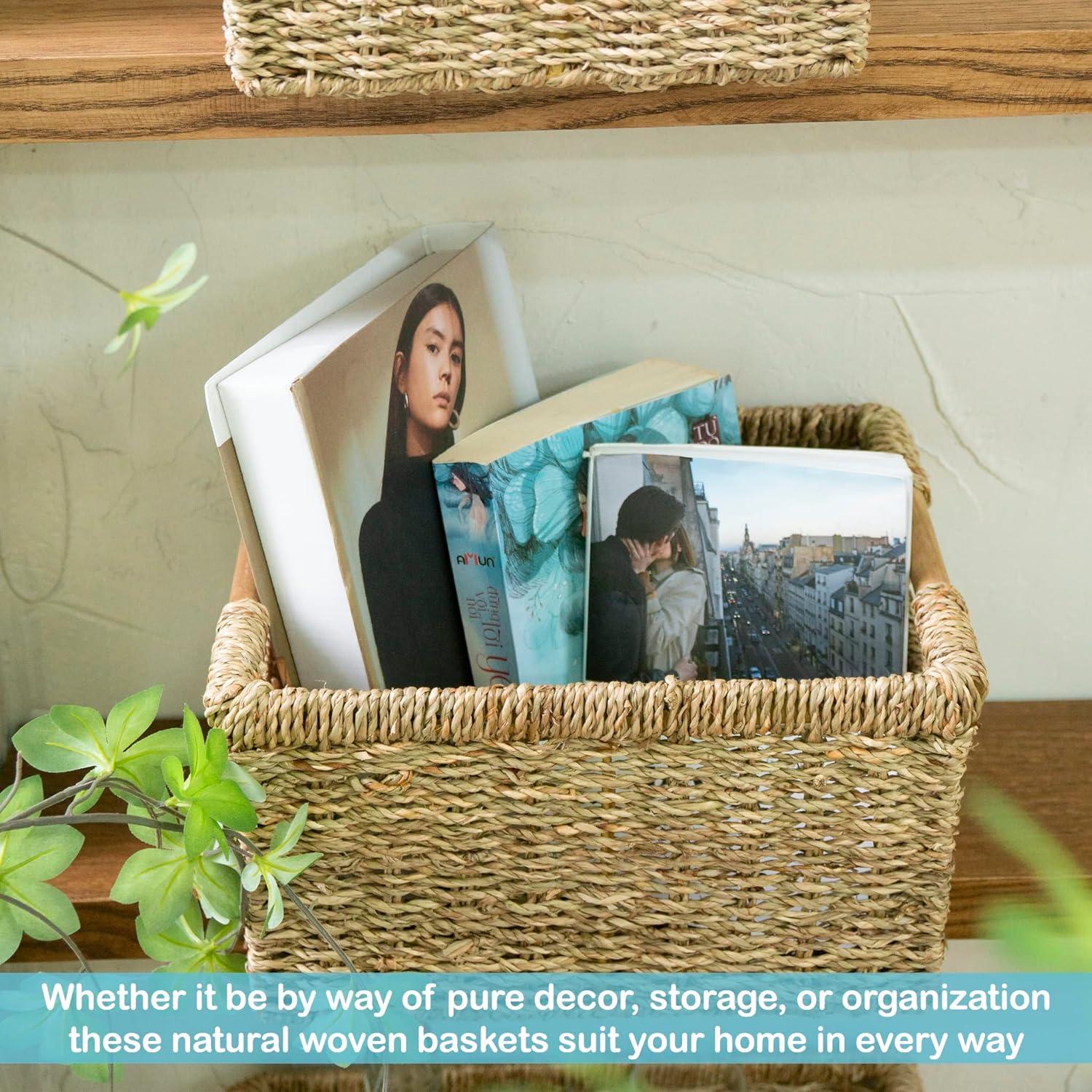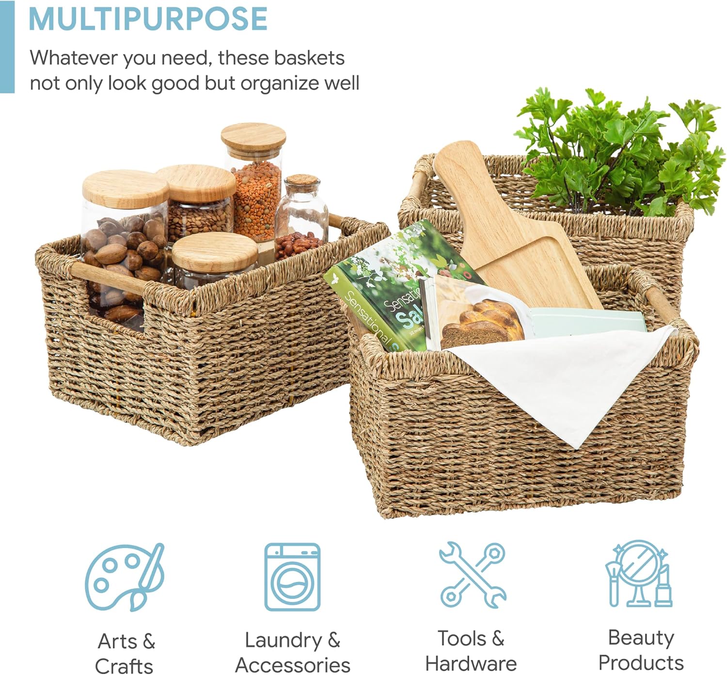 - ✅ Natural & High Quality - Our wicker storage baskets for shelf are made of Seagrass, was carefully handcrafted to perfection. It comes with an iron frame for sturdy storage. The wooden handles on both sides are not only pretty but to help you easy to carry the wicker basket.