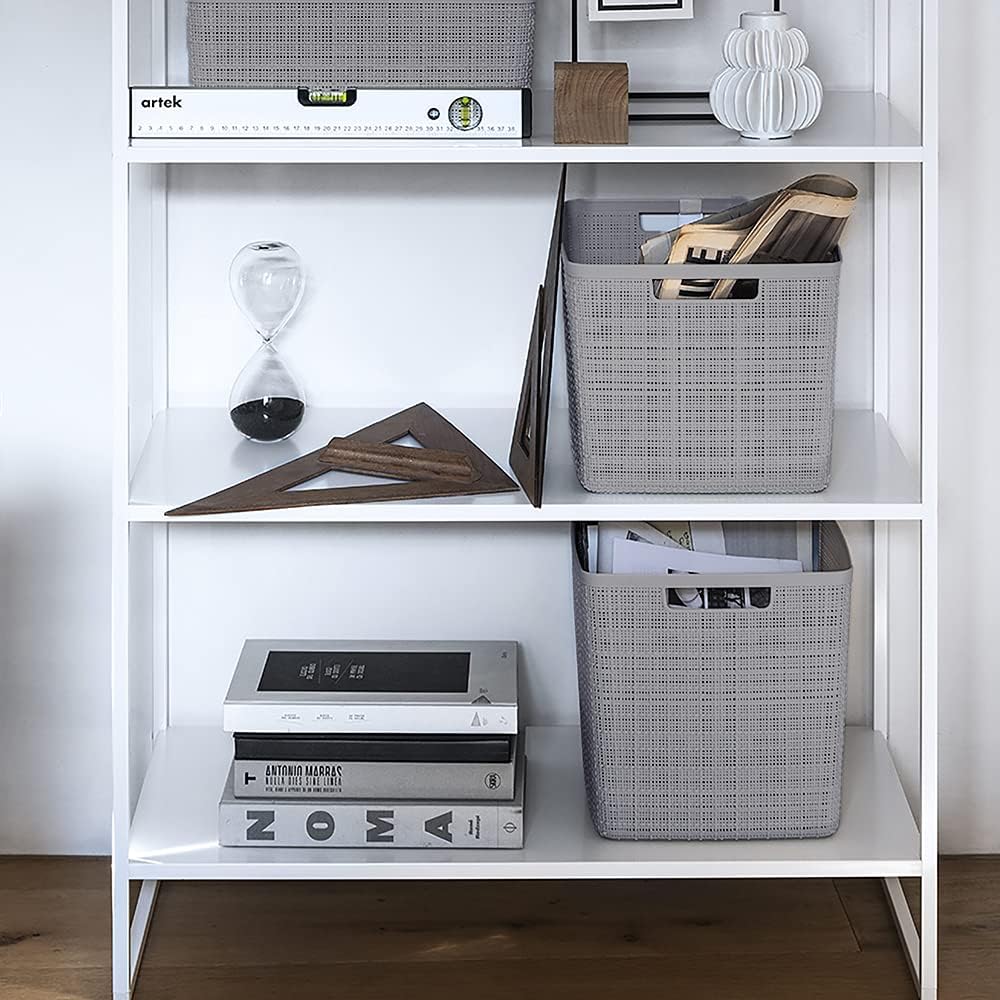 Curver Set of 4 Jute Large Cube Decorative Plastic Organization and Storage Baskets, Perfect Bins for Home Office, Closet Shelves, Kitchen Pantry and All Bedroom Essentials, Grey