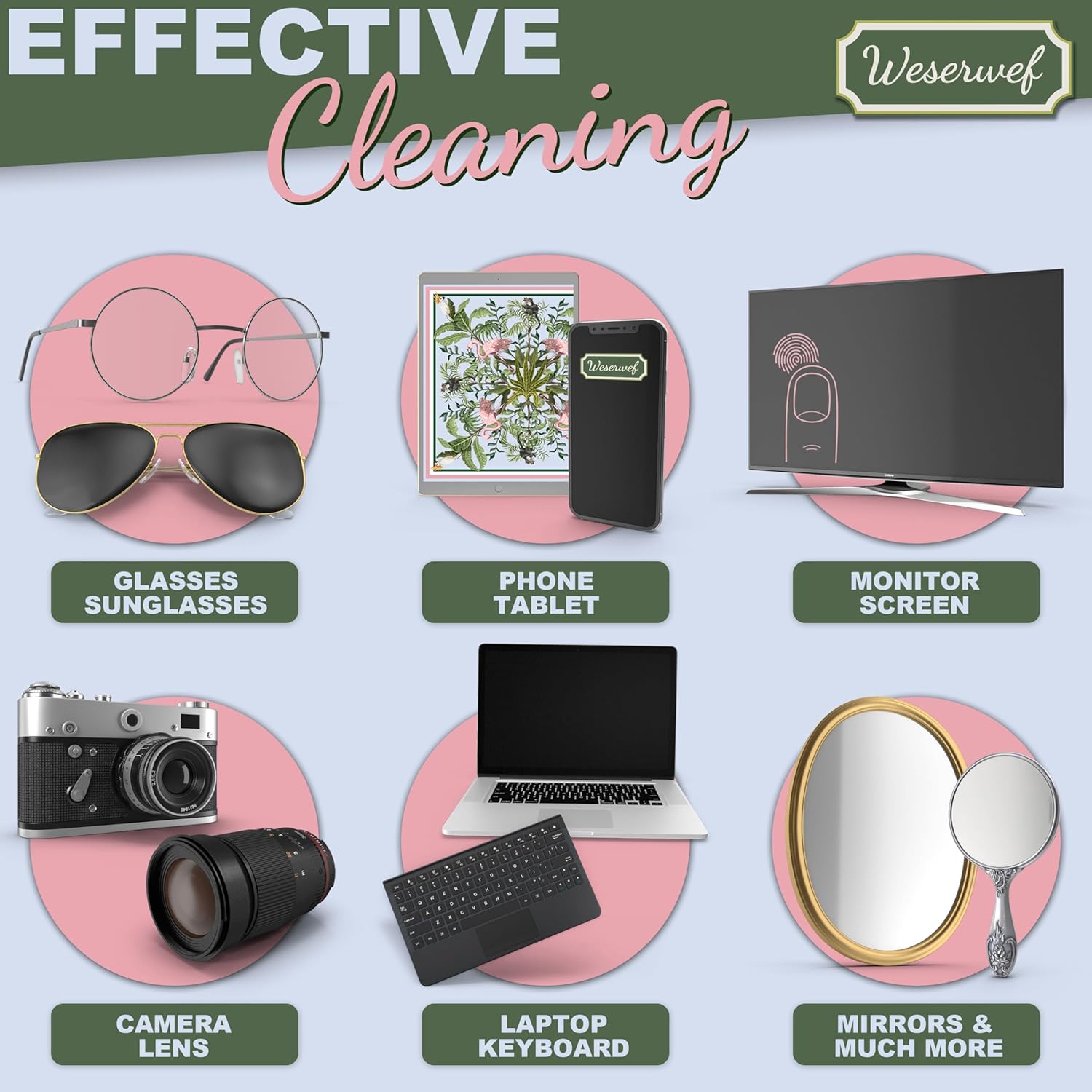 • VERSATILE SCREEN & LENS CLEANER FOR ALL DEVICES: Designed for universal use, this multi-purpose cleaning cloth is ideal for eyeglasses, lenses, smartphones, tablets, laptops, TVs, VR headsets, gaming monitors, binoculars, and more. Whether you need a professional camera lens cleaner, a streak-free phone screen wipe, or a gentle microfiber cloth for delicate optics, Weserwef delivers superior performance across all surfaces.