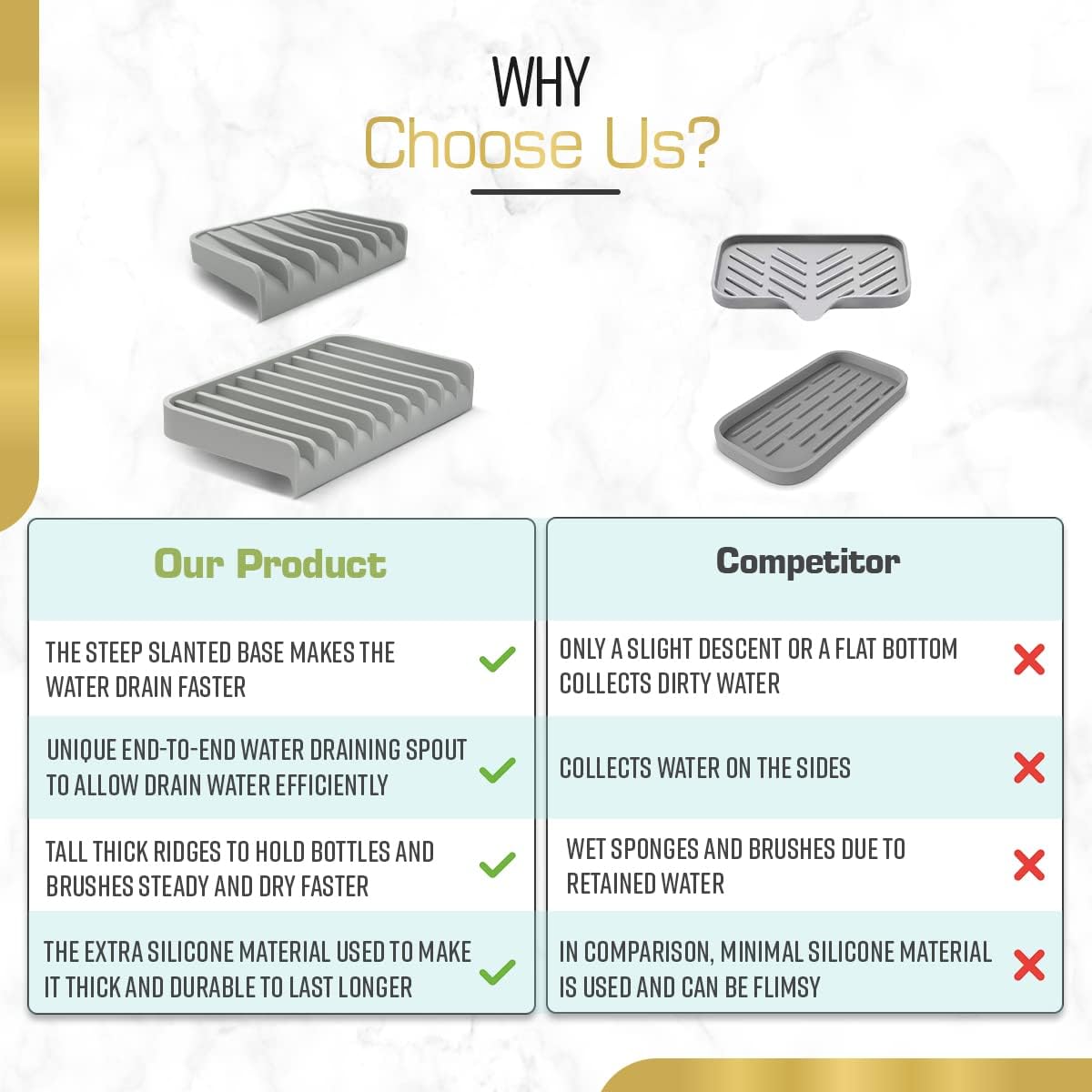 - ✅ FOOD SAFE FLEXIBLE SILICONE AND DESIGNED FOR UNDERMOUNT SINKS: This Kitchen soap tray is made of heat resistant, dishwasher proof (-40°F to 390°F), flexible silicone material which is BPA free. Sponge holder is thick and durable. It can be used as a silicone drying mat for kitchen counter. Dry all your day to day items such as fruits, vegetables, utensils, soap bottles , soap dispenser, sponges, and more. This sink tray comes in 3 great colors Gray, White and Black