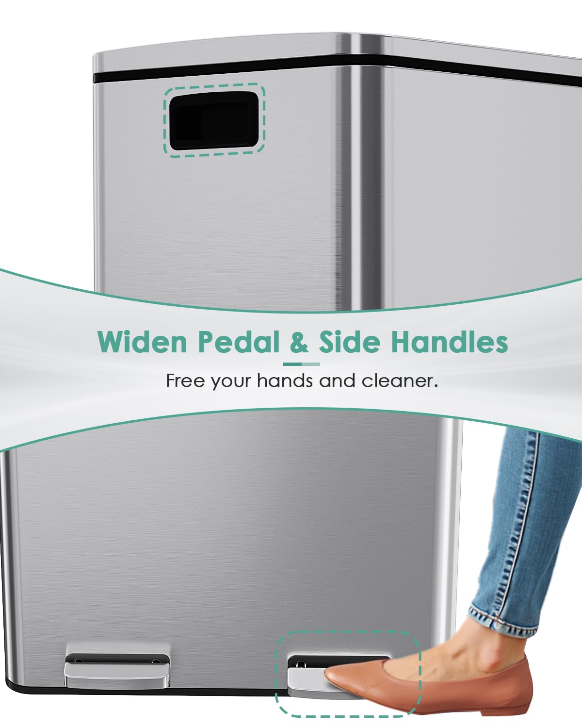 • THICK & WIDE PEDEL: Wide and thick stainless steel pedal is ergonomically designed, so you can throw out trash without bending over, and you don't need to touch the lid of the bucket when throwing out trash.