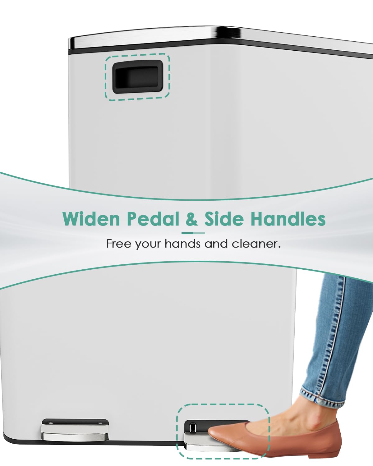 • THICK & WIDE PEDEL: Wide and thick stainless steel pedal is ergonomically designed, so you can throw out trash without bending over, and you don't need to touch the lid of the bucket when throwing out trash.