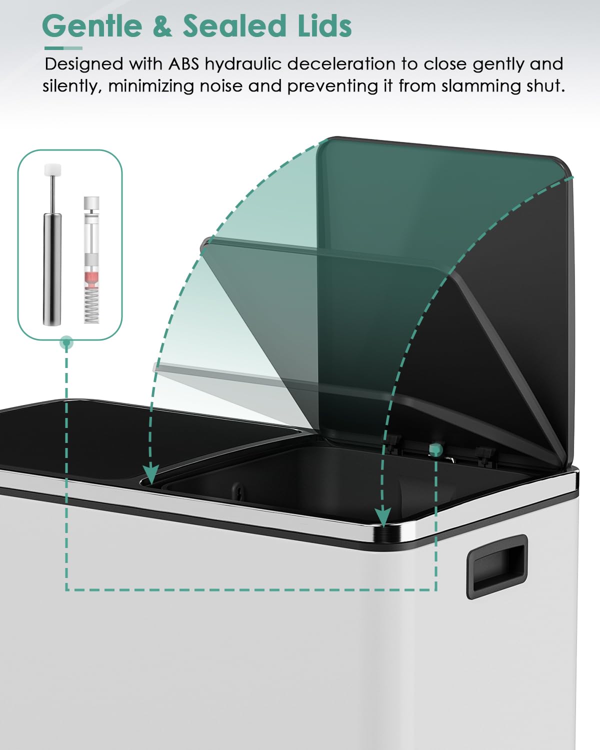 • DUAL TRASH CAN: Trash can has double compartments, which makes it easier for you to separate dry and wet trash. Each compartment has an independent lid to make the trash no smell pollution exists.