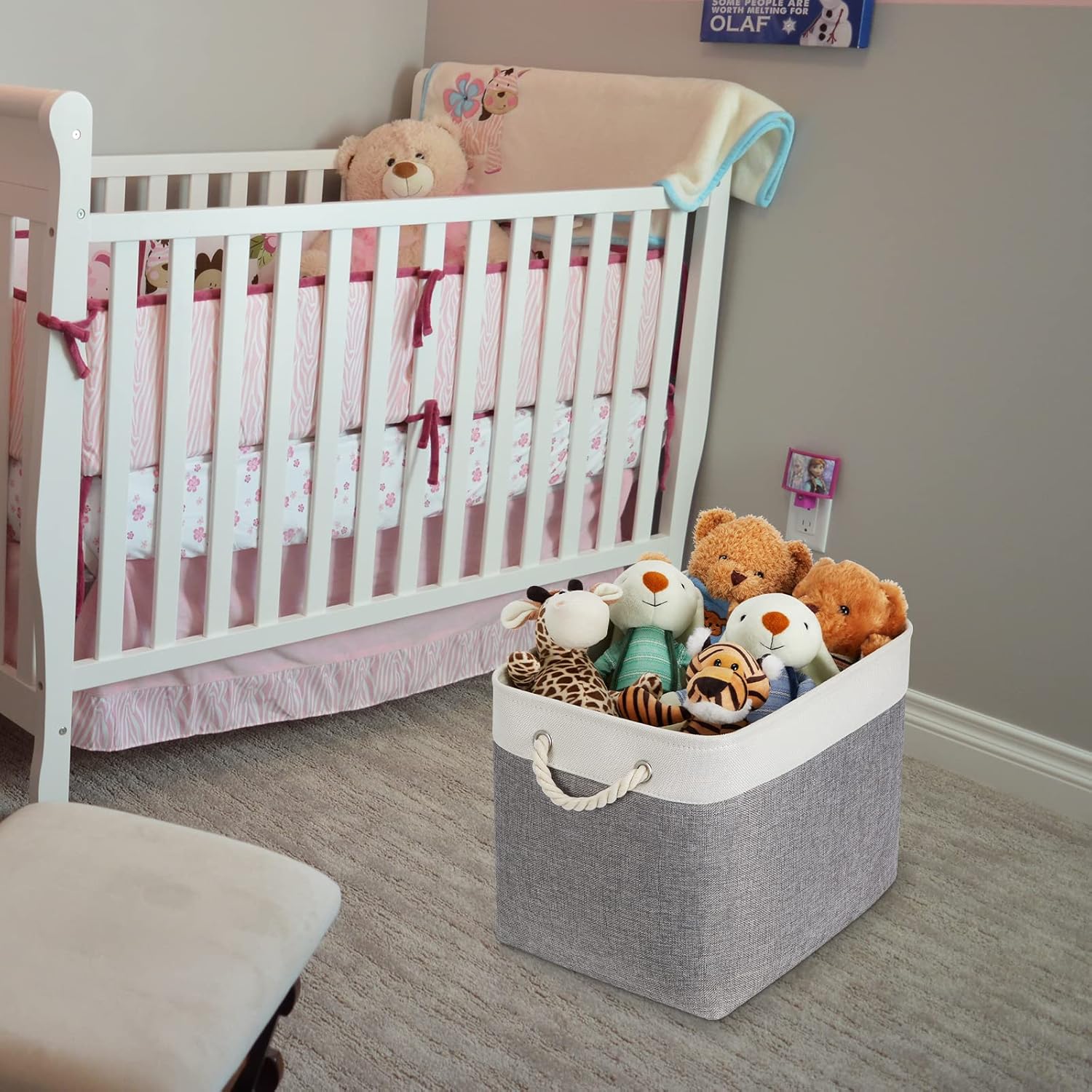 - LARGE BASKET SIZE: 16 (L) x 12 (W) x 12 (H) inches, 2-PACK. Perfect storage baskets for gifts empty, decorative storage bins for organizer. This large basket allowing to store a variety of items. Sturdy gray baskets may be used to hold clothes, towels, blankets, bedsheet, DVDs, magazines, books, shoes