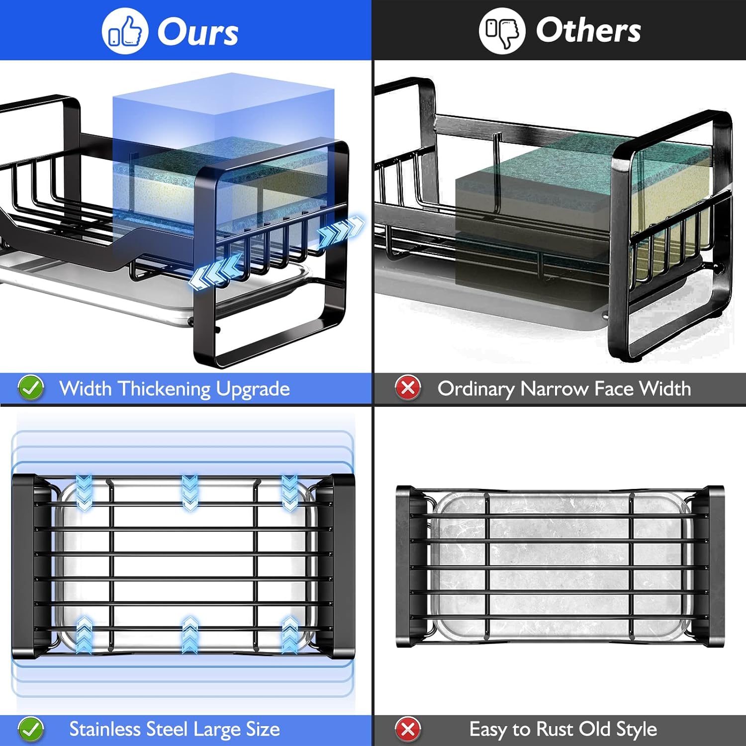 • 【Larger Capacity】Extended to 4 inches in width and 7.15 inches in length. Compared with other kitchen sink sponge holder , the length and width are improved. Therefore, this sponge holder can bring more storage space and improve the storage capacity. The Kontoyo sponge holder is perfect for storing sponges,dish soap,soap dispenser,brushes. Keep your kitchen sink counter clean and tidy