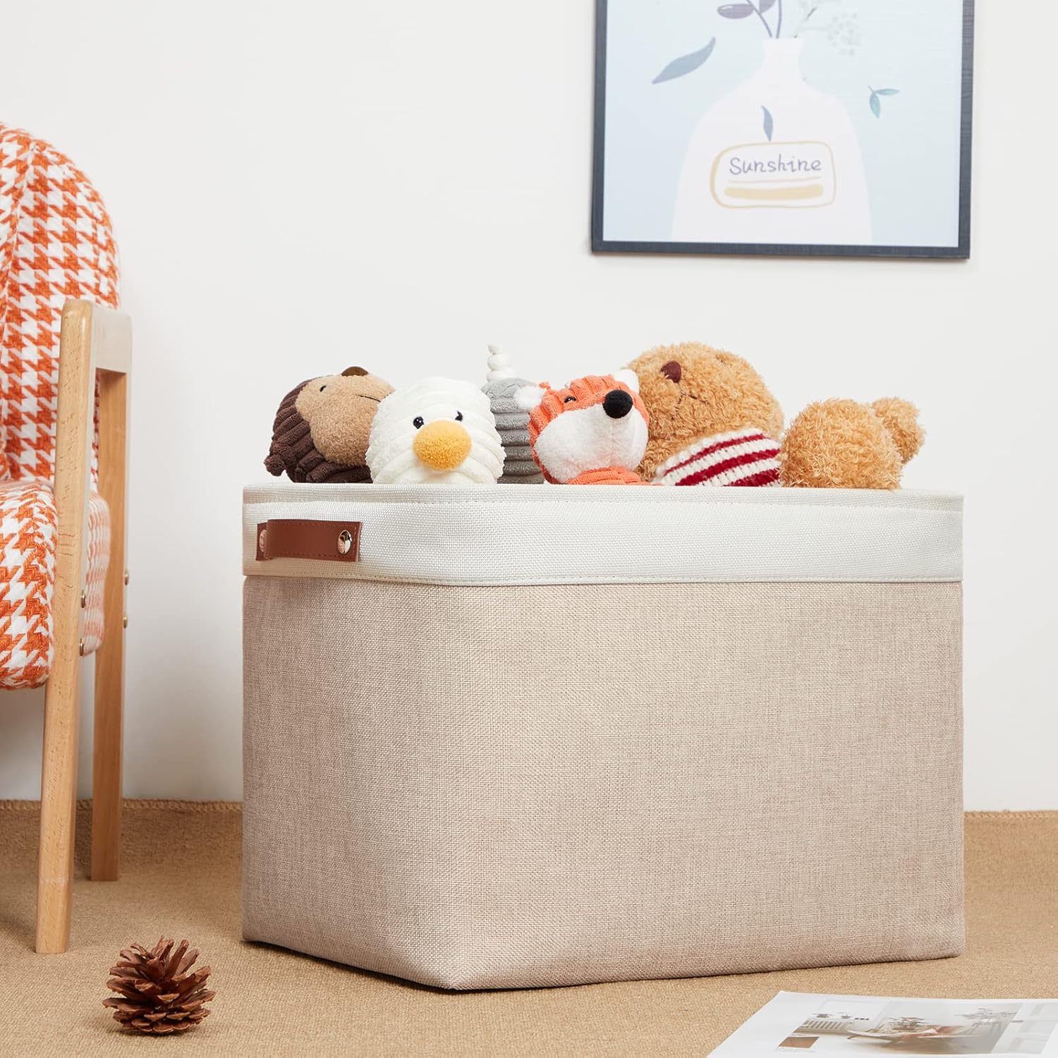 DULLEMELO 2-Pack Large Storage Baskets for Organizing 16"x12"x12" Canvas Fabric Storage Basket Bins With Leather Handles for Shelf Clothes Empty Gift Basket (White&Khaki)