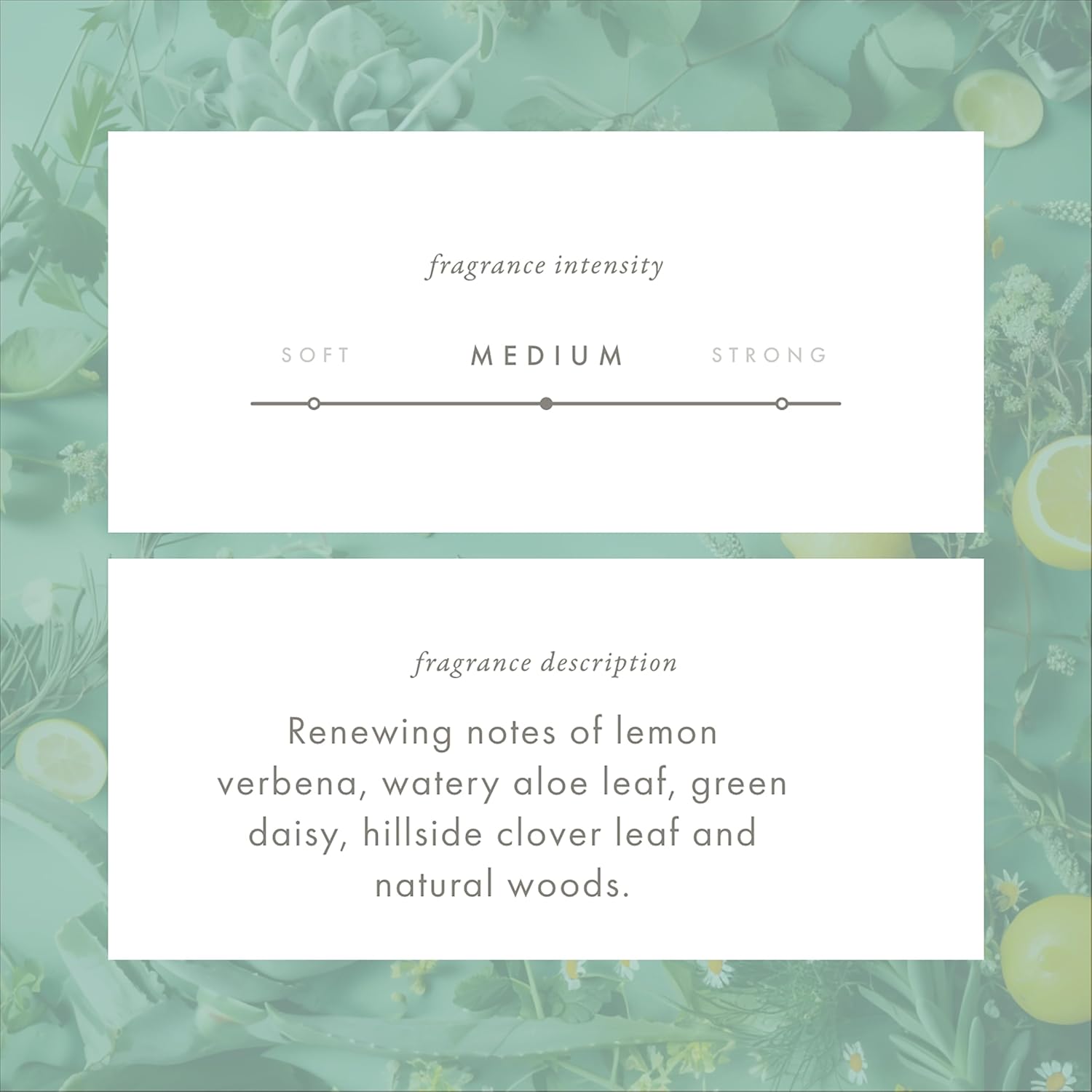 • YOU LIE IN A SPRING-FRESH MEADOW OVERLOOKING A LUSH VALLEY BATHED IN FULL, CLEAR SUNLIGHT. The surrounding world buzzes with life and rebirth. Earth’s perfume is that of Green Clover and Aloe, with its aromas of bright, green daisy, lemon verbena, fields of clover, and inviting woodsy notes. It's at once invigorating and calming—as a day spent in nature often is.