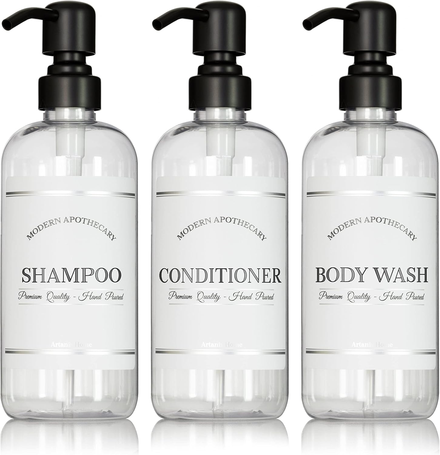 - Bring Style To Your Bathroom: Revel in the luxury of a well-organized shower. Refine your interior decor with these chic body wash, conditioner and shampoo dispenser bottles. Curate your whole home. Modern Apothecary bathroom bottles coordinate with additional matching titles for the sink, kitchen, office, and rentals. Classy, with a touch of retro flair