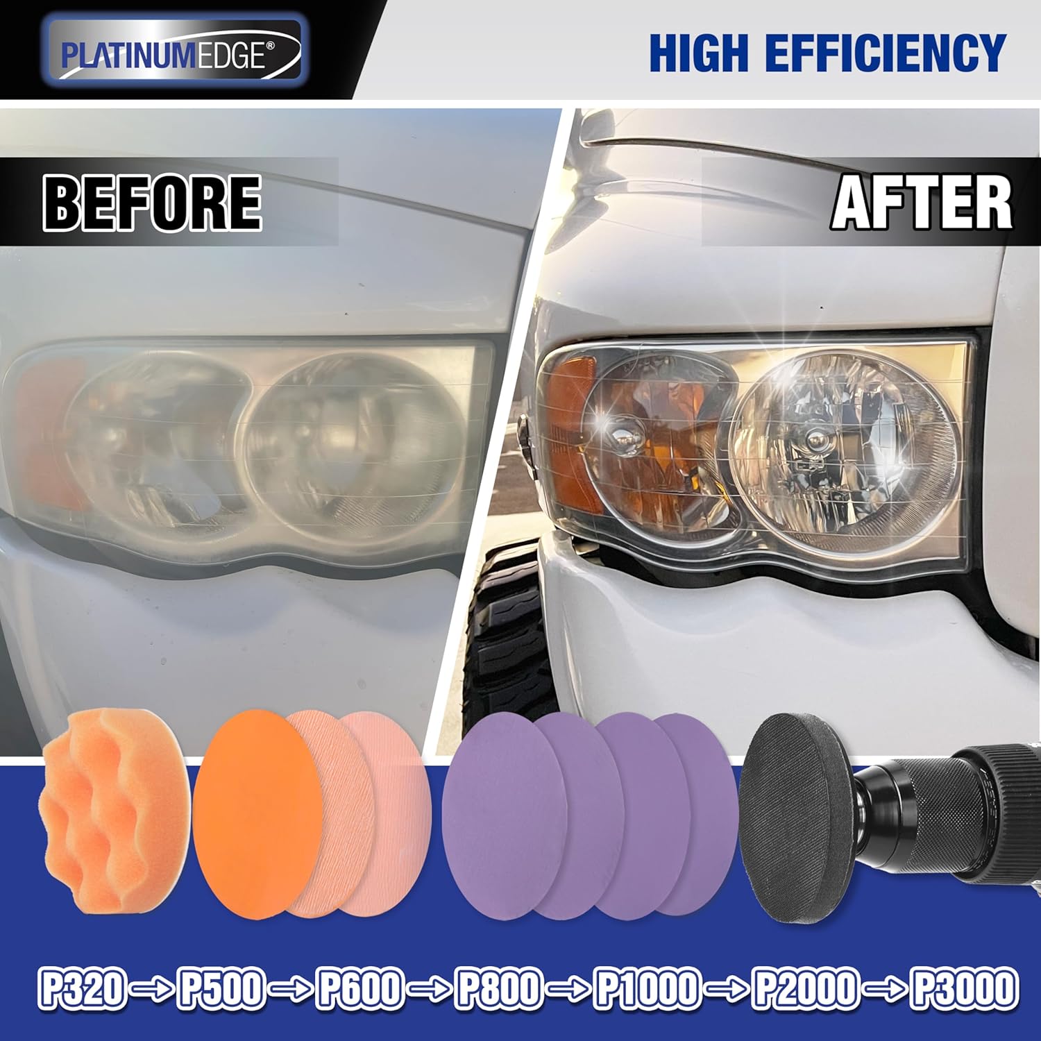 PLATINUMEDGE Car Headlight Restoration Kit, 3 inch Car Headlights Lens Polishing Sanding Discs with 3 inch Buffing Polish Pads for Drill, 30 Pc Car Headlight Restorer and Renewer Kit