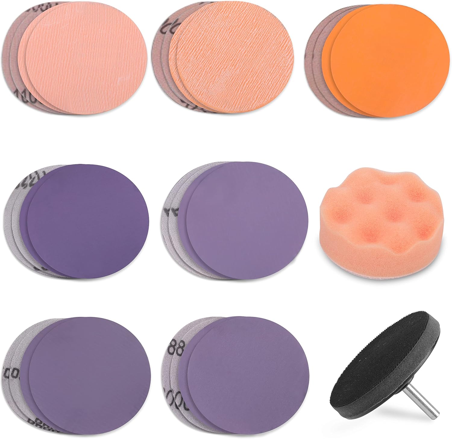 • Package Include: Comes with multiple sanding discs. 4 pcs each of 3 inch 320, 500, 600, and 800 Purple Grit Sanding Discs. 4 pcs each of 1000, 2000, and 3000 Orange Grit high-precision waterproof sanding discs. Also includes 1 Disc Pad Holder and 1 Buffing Sponge pad.
