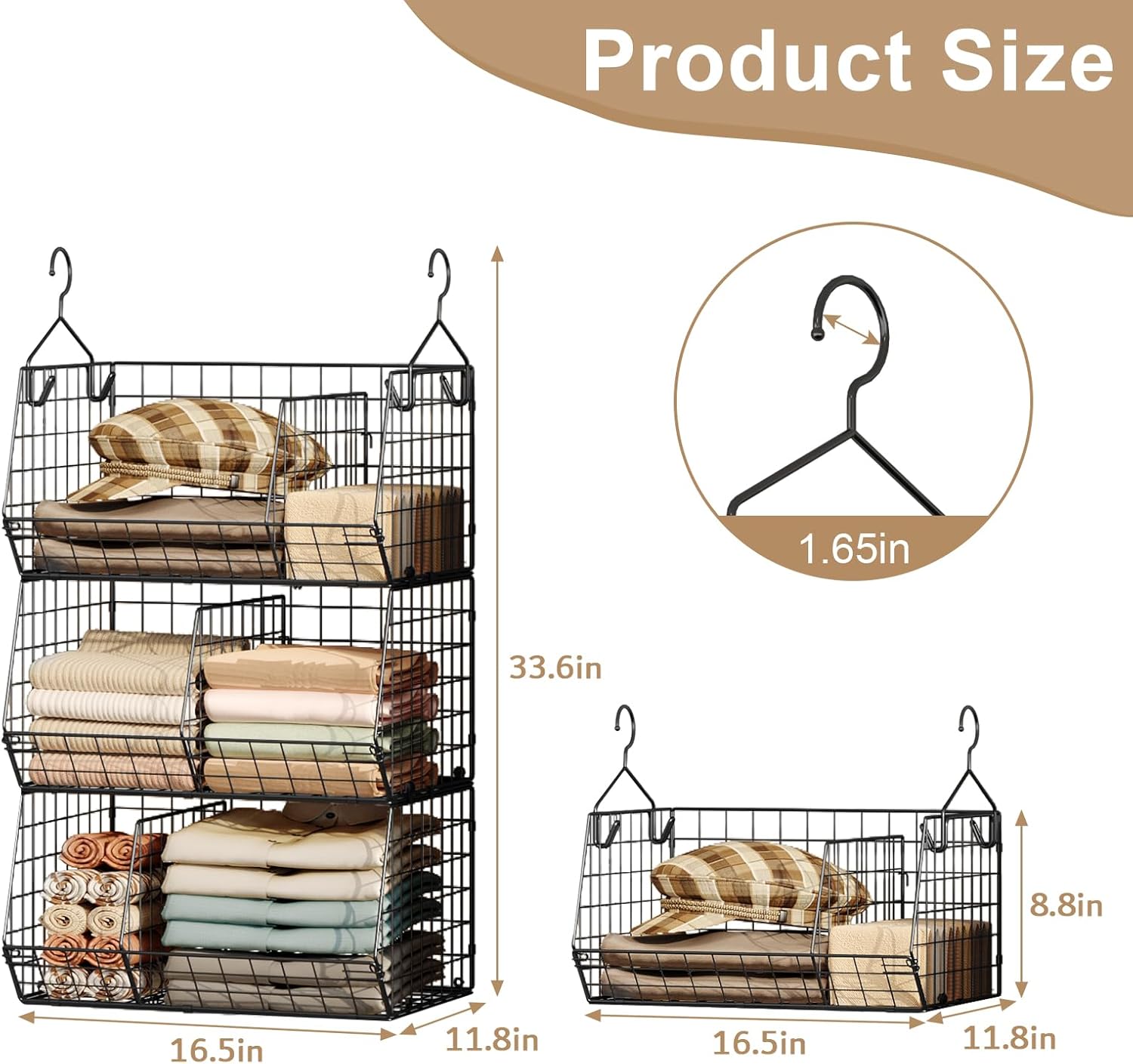 - 3 in 1 or Use Alone: Closet hanging organizer is the layered design, used alone or stacked according to your own need and idea. And you can screw all the three baskets together and hang them as a unit on the closet rod to store clothes, hats, sweaters, jeans, shirts, shoes, purses and other accessories. Also, you can hang 2 baskets on the wall, and place 1 on the shelf. You can DIY the using methods.