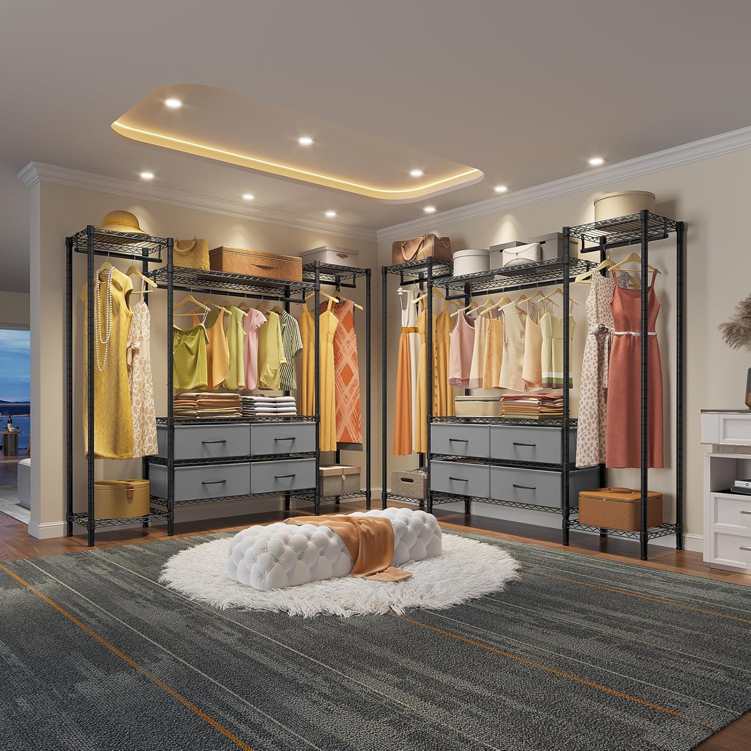 • Package Included: 1 set garment rack, 4pcs fabric storage boxes.