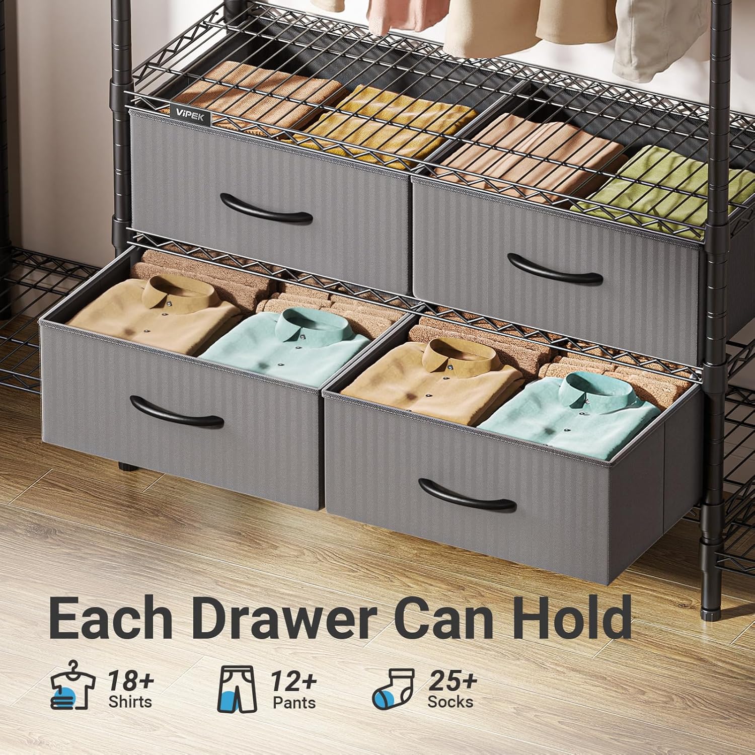 VIPEK V20 Wire Garment Rack Heavy Duty Clothes Rack, Metal Clothing Rack with 6 Shelves, 3 Hang Rods & 4 Fabric Drawers, Compact Wardrobe Closet, 56.7" L x 14.6" W x 70.9" H, Black