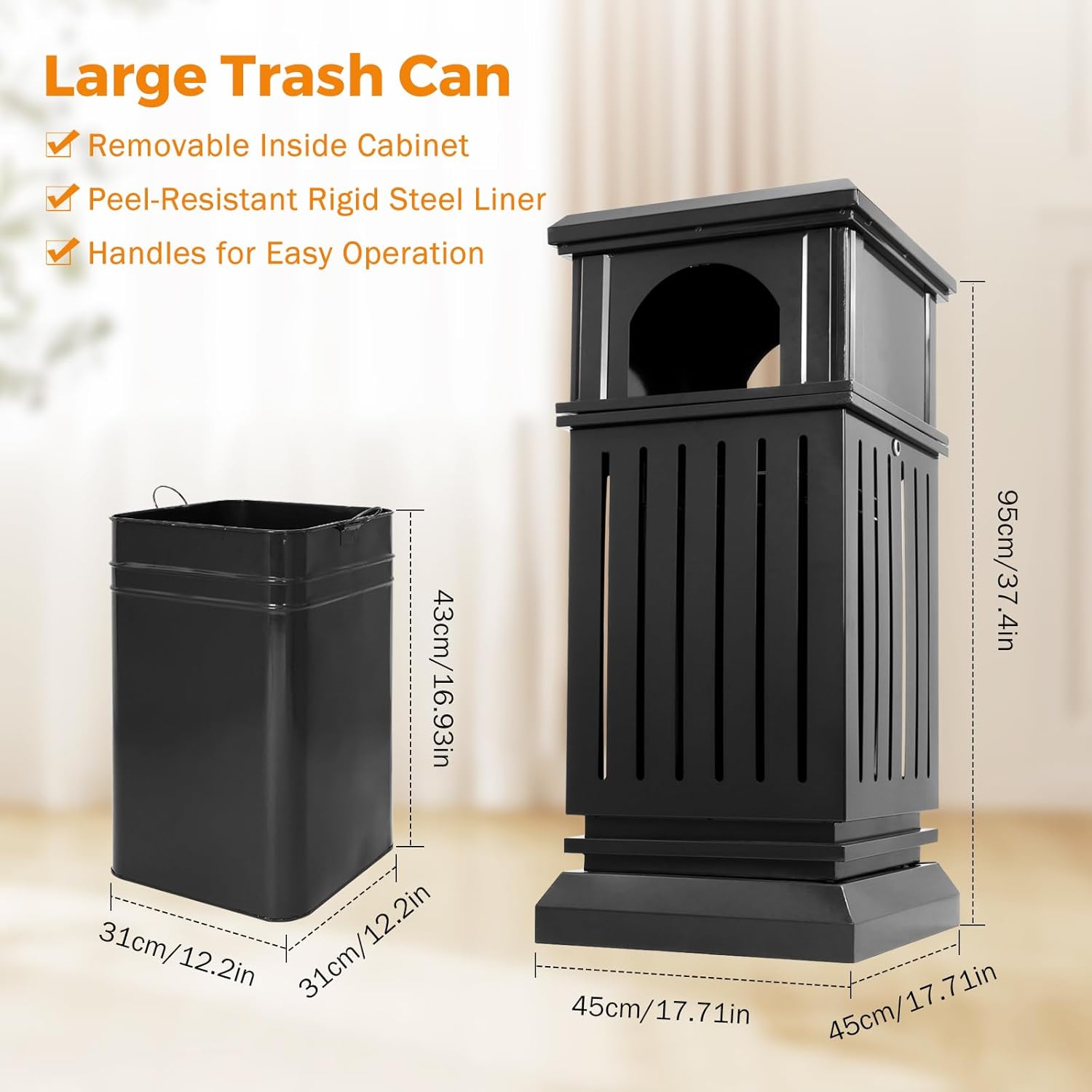 • MODERN STYLE - BEAMNOVA Black Stainless-Steel Trash Can with Ash Tray features stylish perforated panels, two convenient openings, and a top tray that enhances high traffic areas while keeping them clean and litter-free. Suitable for commercial indoor or outdoor places, such as patio, park, lobby, mall, yard, garage, office, hall, etc.