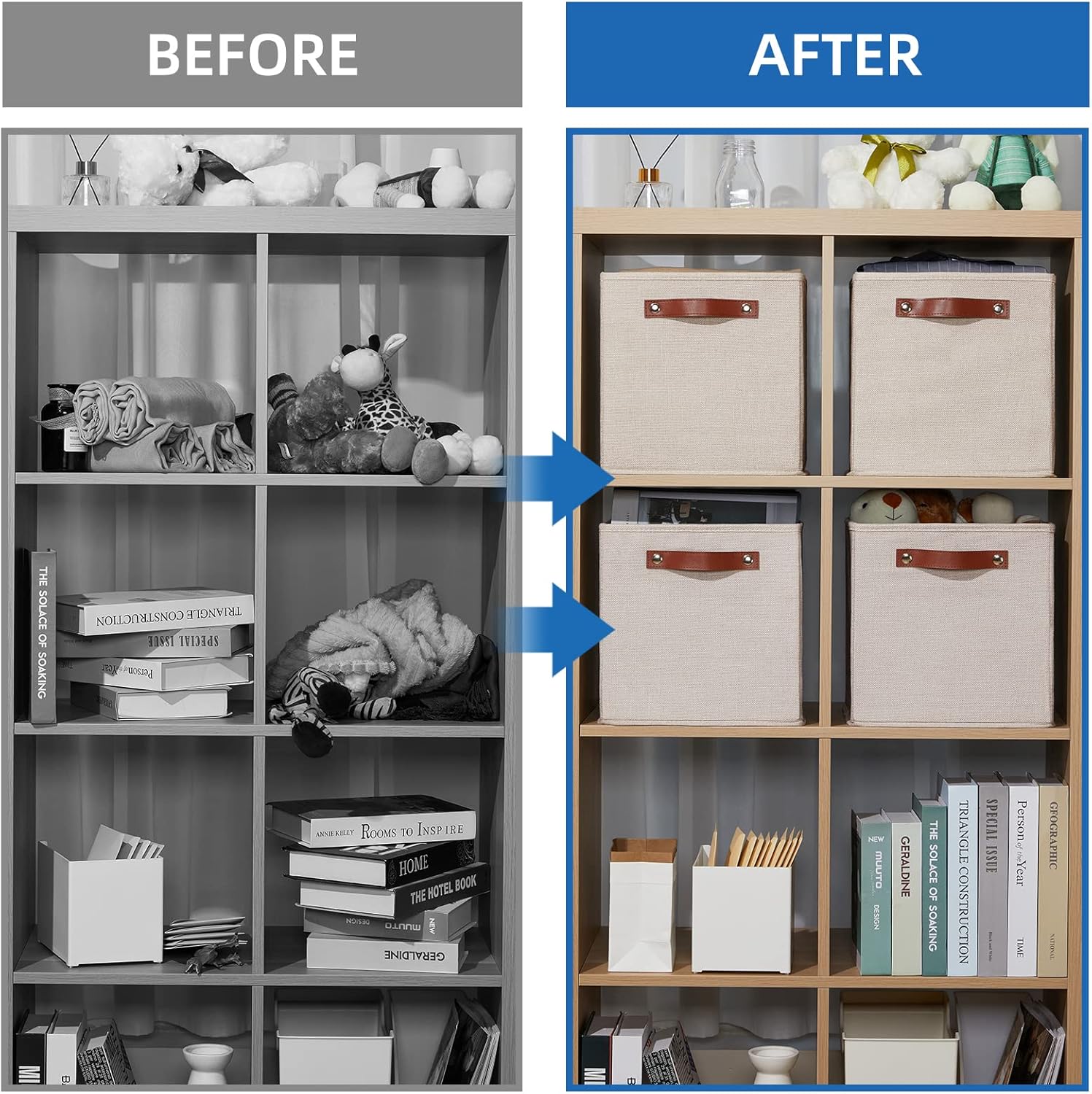 Temary 11x11 Storage Cubes Fabric Storage Cubes Storage Bins with Dual Leather Handles Canvas Storage Boxes for Organizing Home, Shelf, Closet (Beige, 11 x 11 x 11)