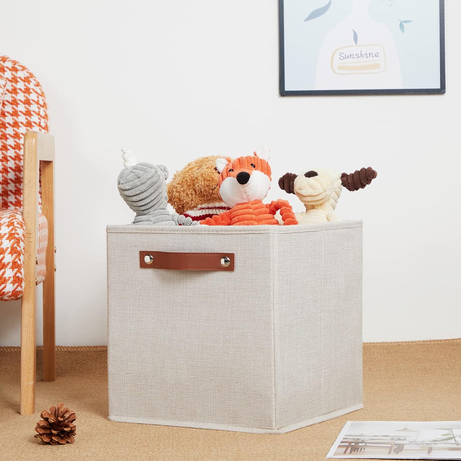 - 【Sturdy Leather Handles 】Sturdy thickened leather handles and metal iron buckles make them easy to carry even with a heavy load. Cardboard is inserted at the bottom and sides to provide support, so that these decorative cube storage cubes bin to stand on, holding the shape well and can be used for a long time